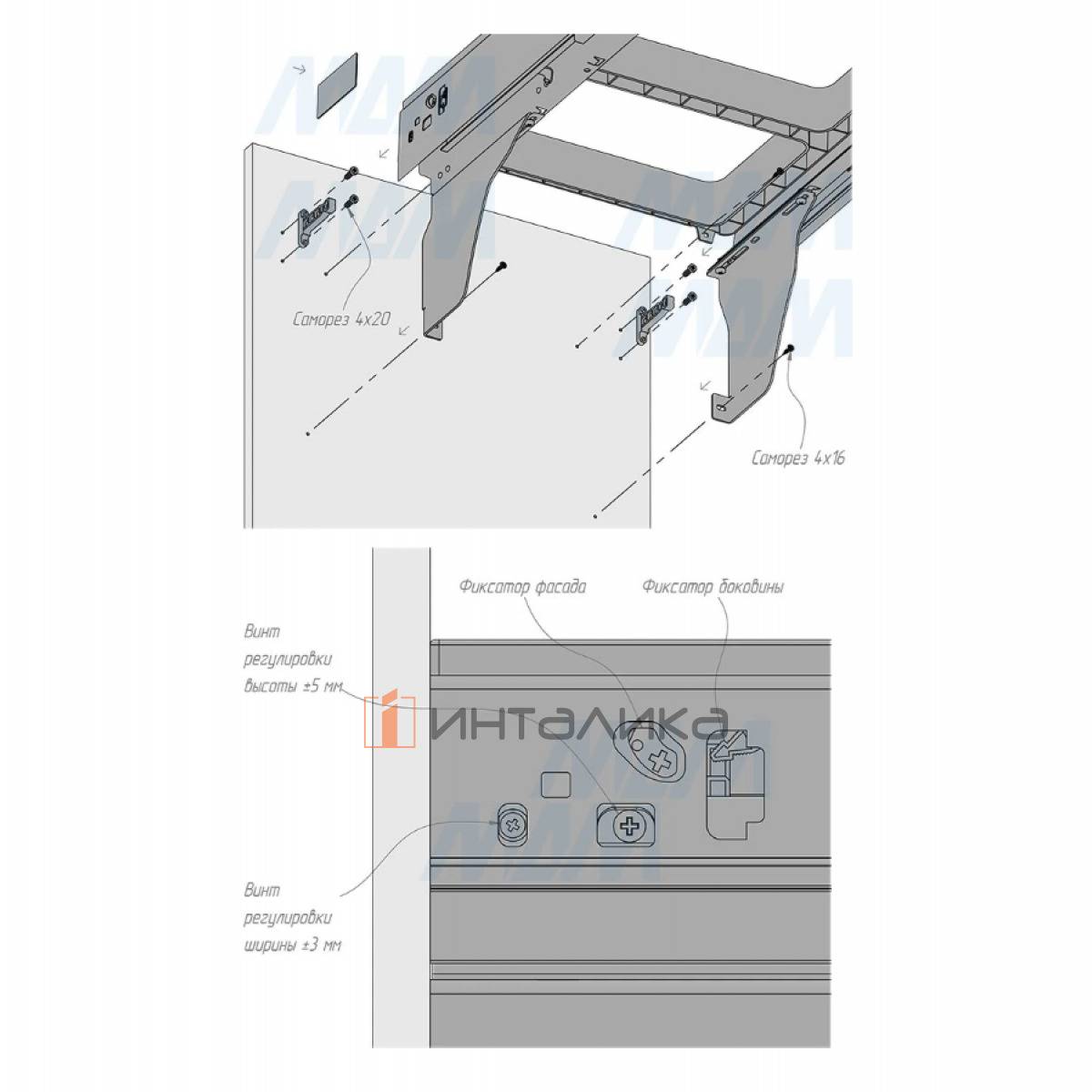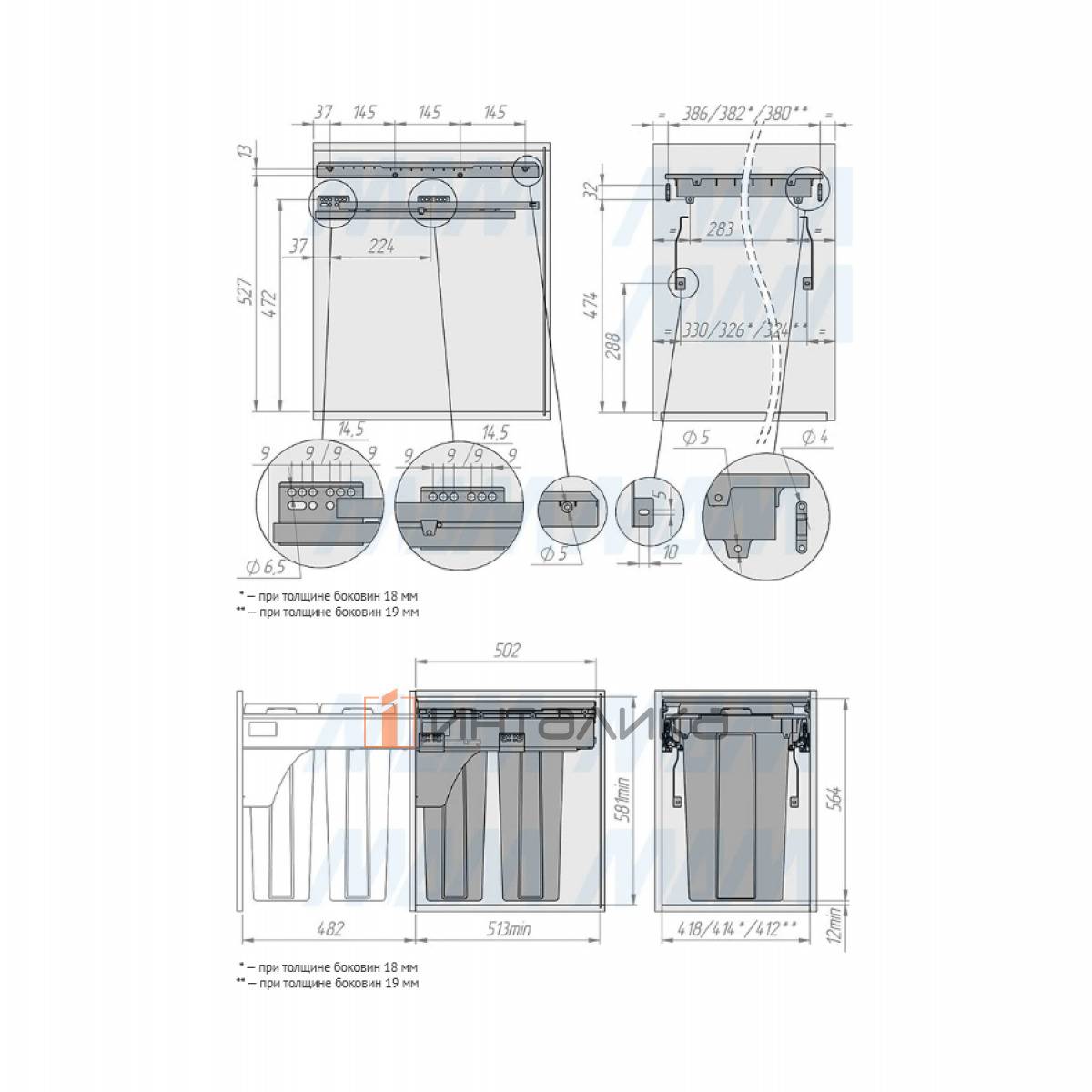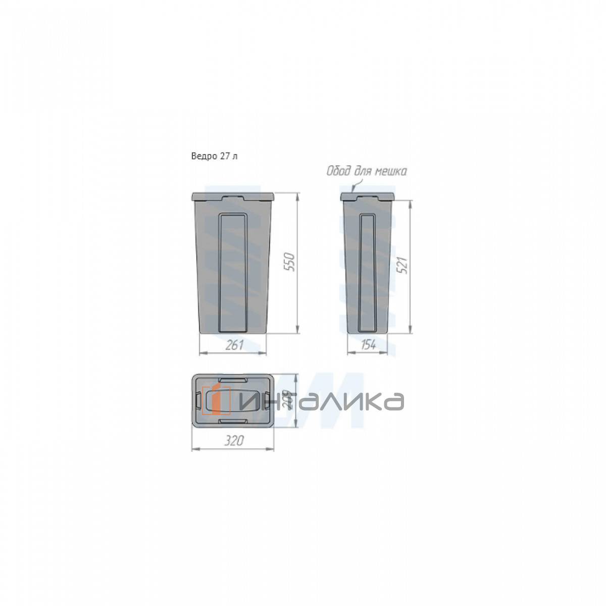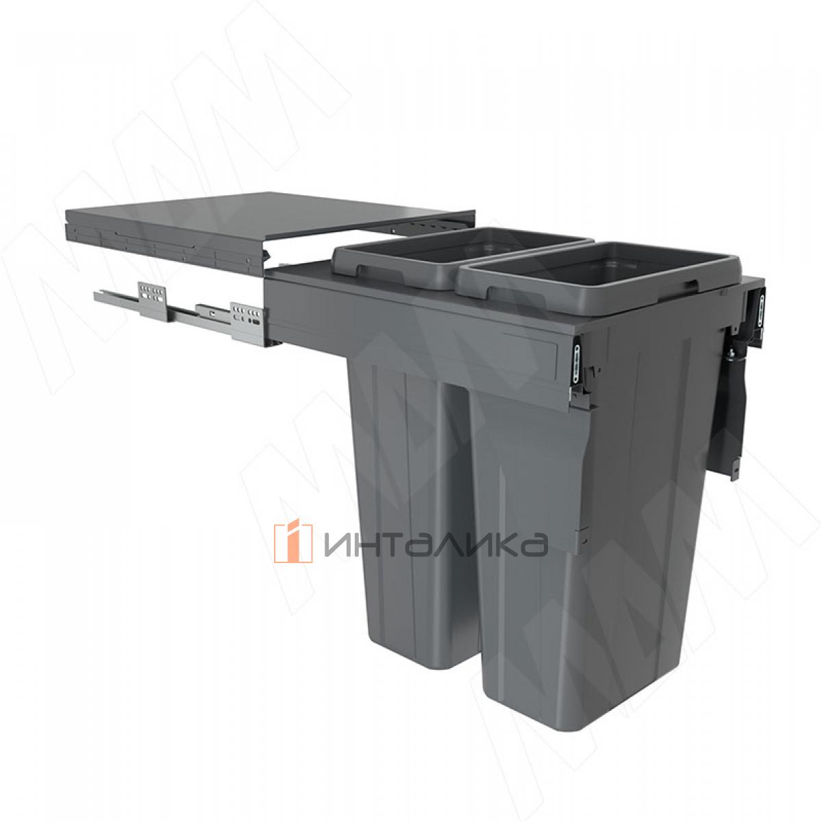 Комплектация: рама - 1 шт., боковины рамы - 2 шт., направляющие рамы - 1 компл., крепление фасада - 2 шт., ведро с рамкой для пакета и ручками - 2 компл., заглушки креплений фасада - 2 шт., стационарная крышка-полка - 1 шт., боковины полки - 2 шт., противоскользящее покрытие - 1 шт., крепёж - 1 кпл.