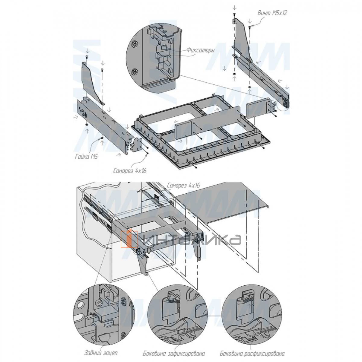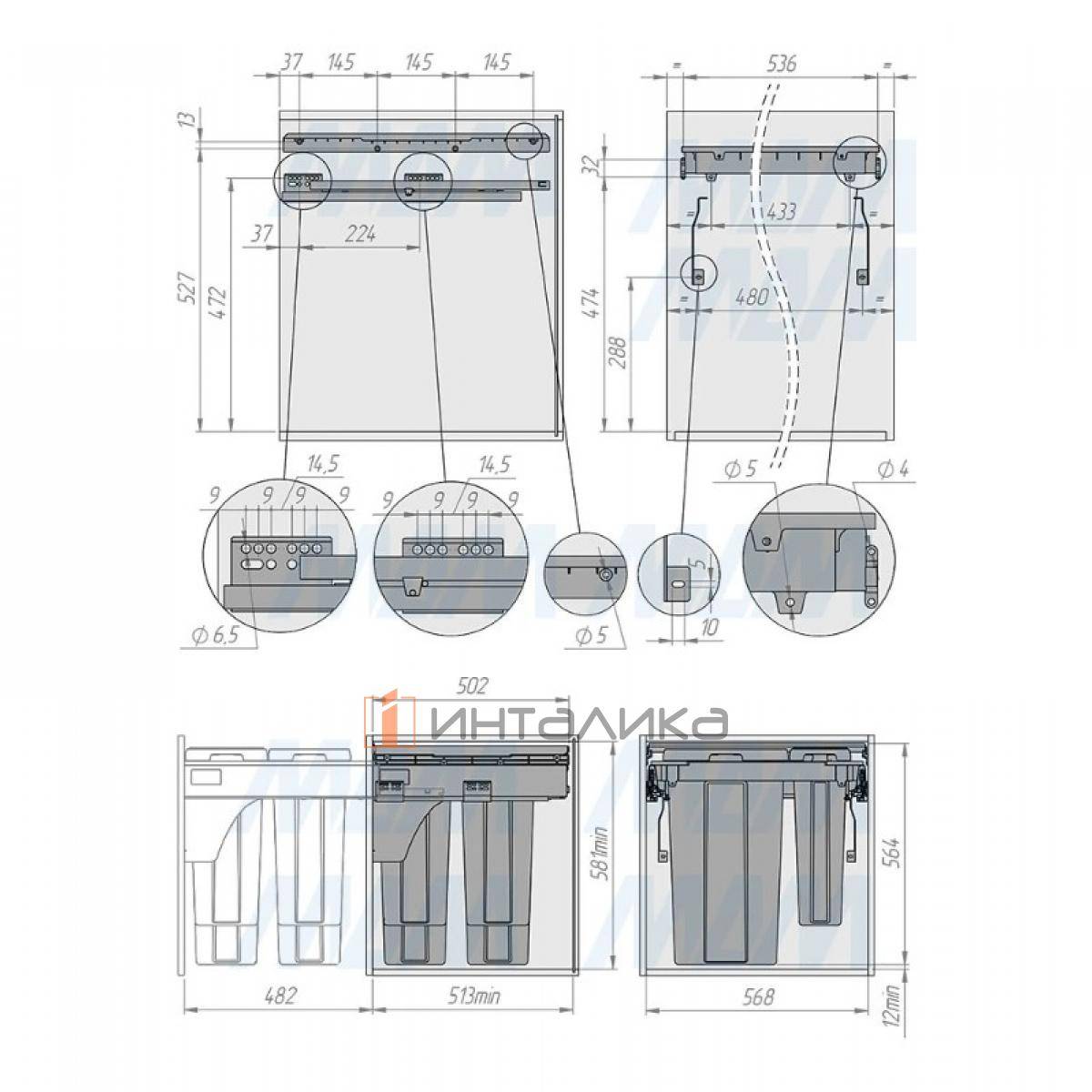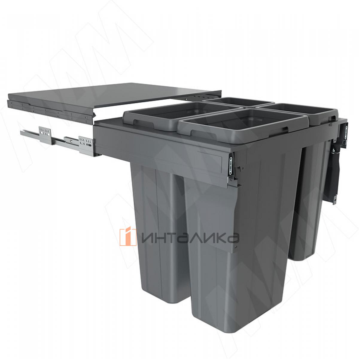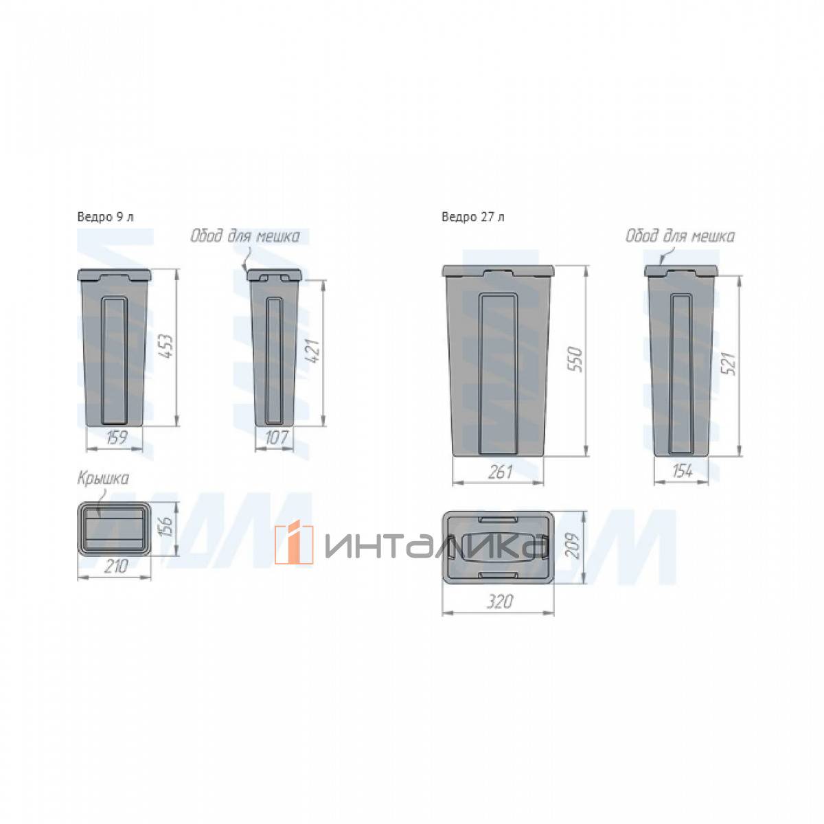 Комплектация: рама - 1 шт., боковины рамы - 2 шт., направляющие рамы - 1 компл., крепление фасада - 2 шт., ведро с рамкой для пакета и ручками - 4 компл., заглушки креплений фасада - 2 шт., стационарная крышка-полка - 1 шт., боковины полки - 2 шт., противоскользящее покрытие - 1 шт., крепёж - 1 компл.