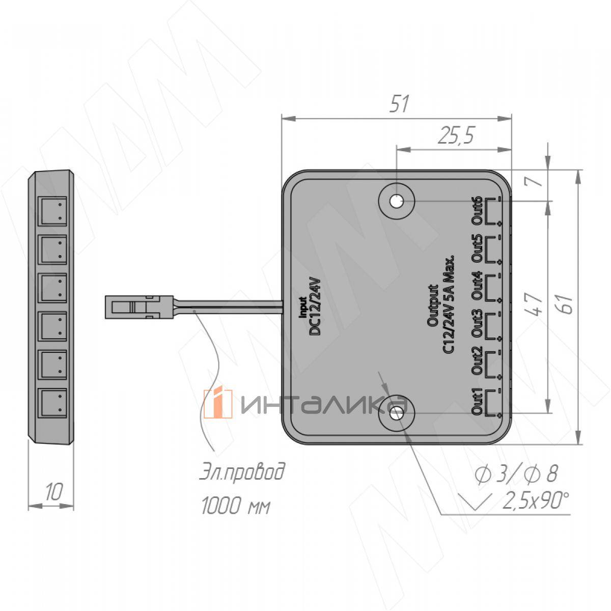 Ресивер для беспроводного выключателя, с 6 разъемами LED, 12/24В, 60/120Вт, IP20, цвет черный, SW1-REC-RC-BL