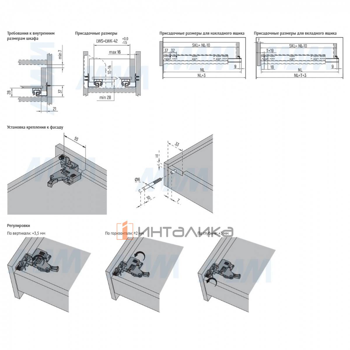 • трёхмерная регулировка фасада без инструментов: по горизонтали: ±2 мм, по вертикали: +3,5 мм; по глубине: +3 мм;