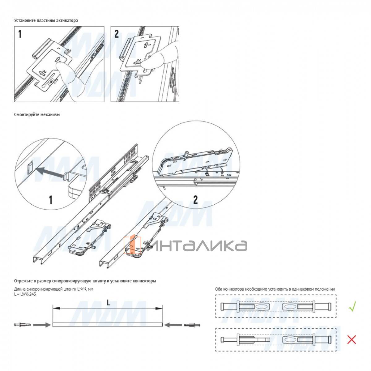 Комплектация: направляющие Quantum QS (левая+правая) полного выдвижения Soft-close, крепления к фасаду с 3D-регулировкой; механизм открывания от нажатия QTS-Mech (левый+правый) с активаторами, фиксаторы - 2 шт., коннекторы - 2 шт.; синхронизирующая штанга QTS-S.Rod.