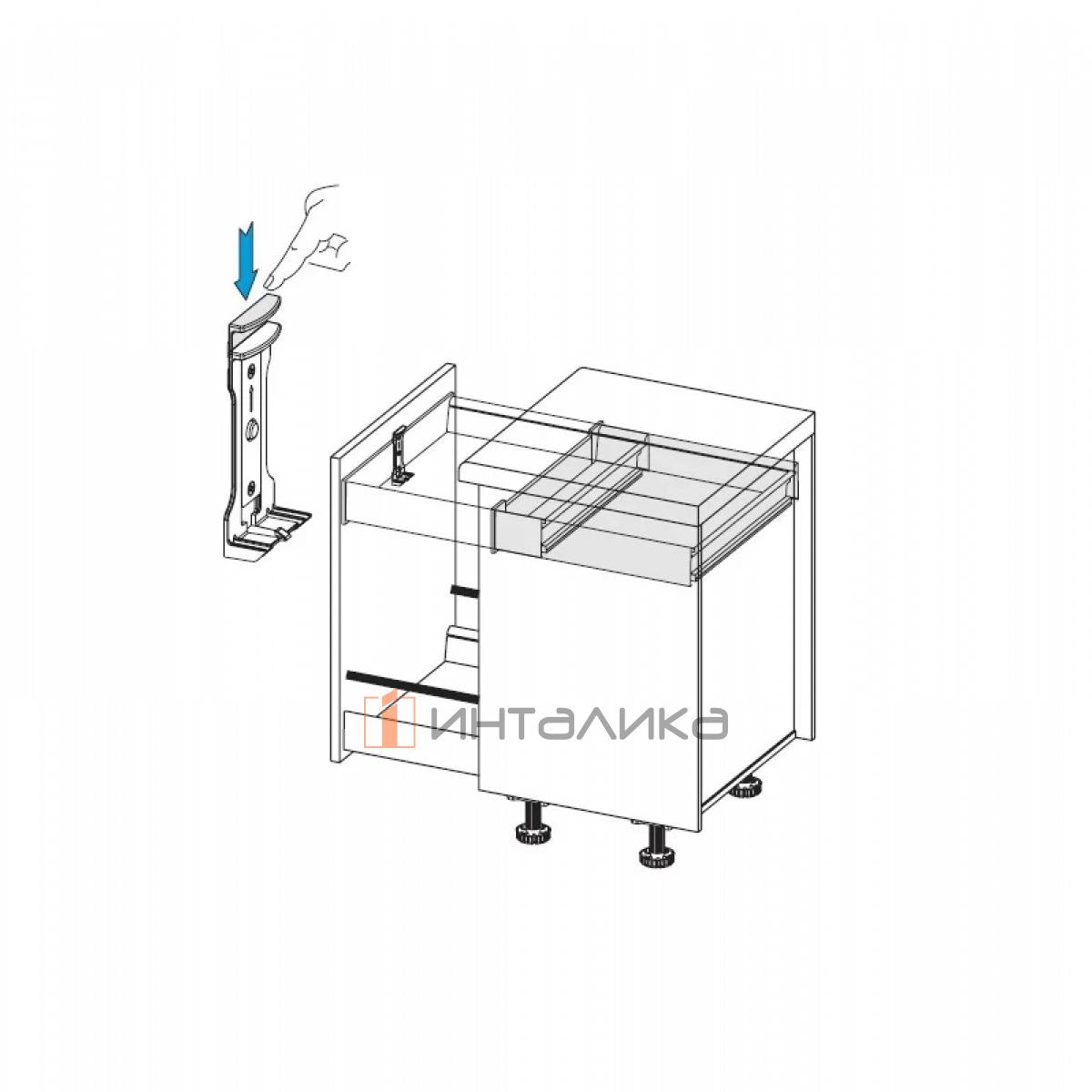 При закрытии ящиков происходит автоматическая фиксация обеих частей механизма, для разъединения необходимо нажать на специальный регулировочный ползунок