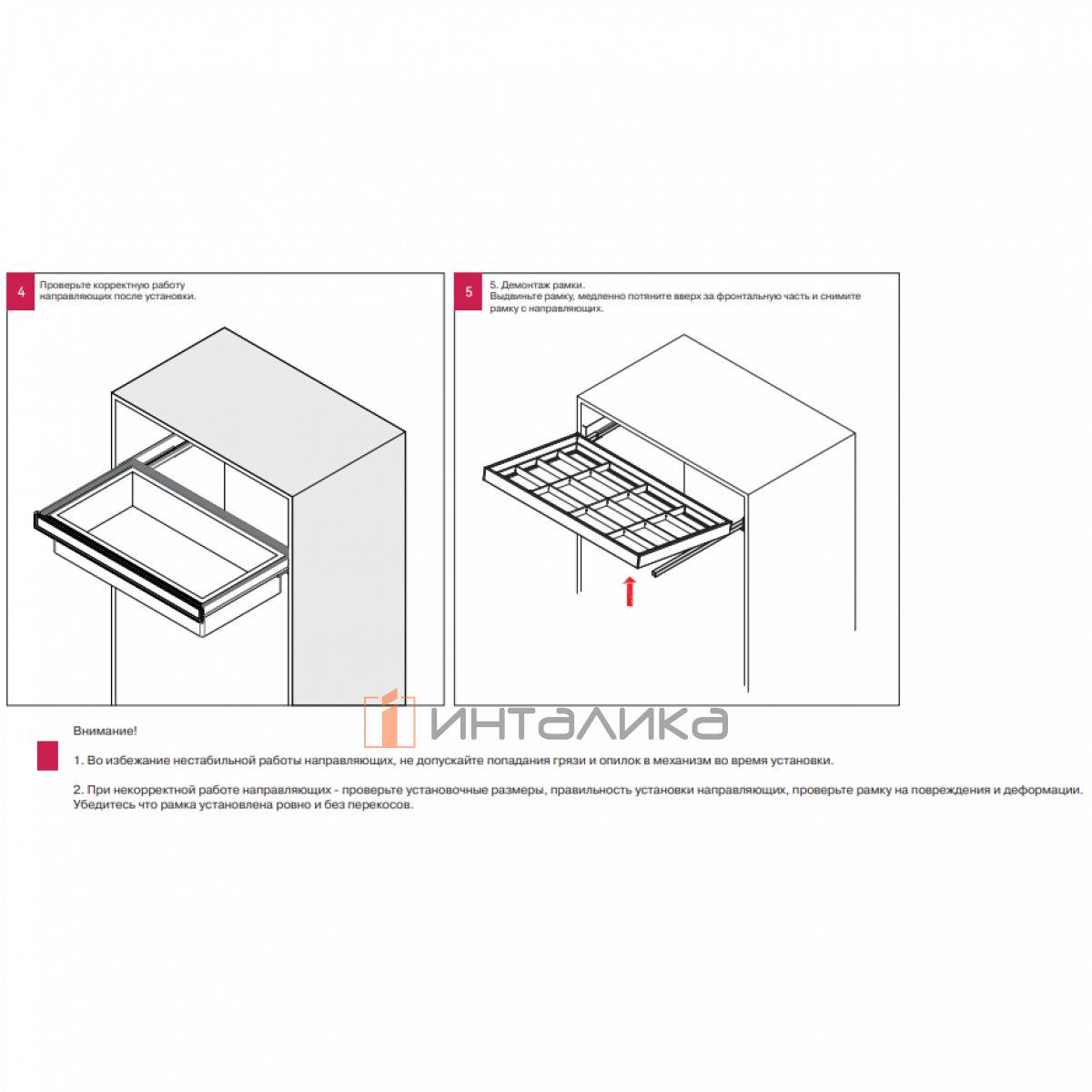 Скрытые направляющие полного выдвижения со встроенной системой демпфирования позволяют закрывать фасады плавно и бесшумно