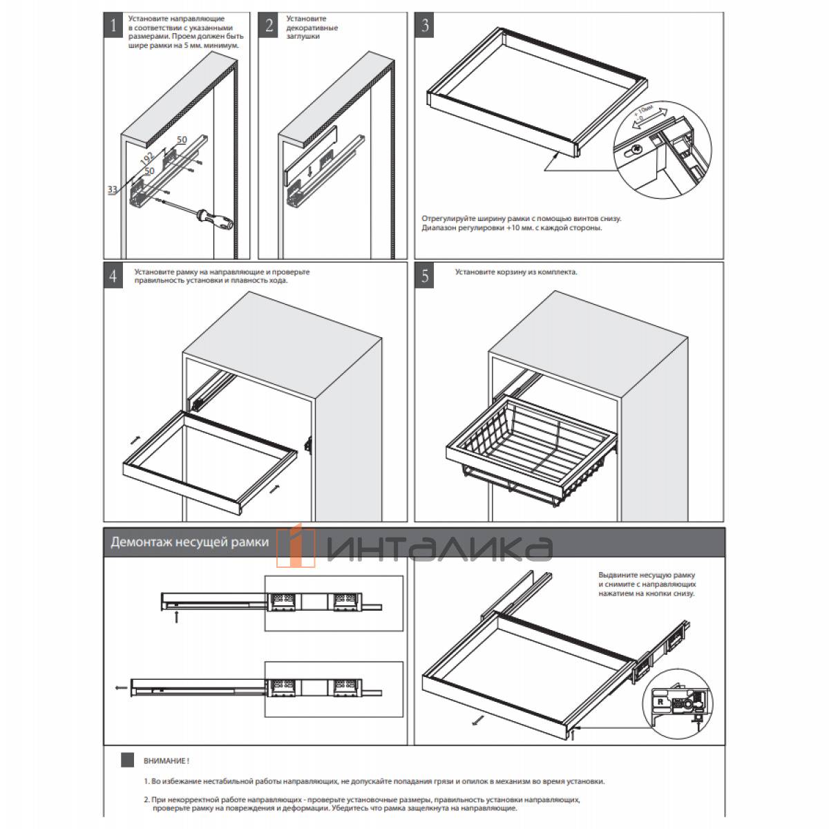 Скрытые направляющие полного выдвижения со встроенной системой демпфирования закрывают фасады плавно и бесшумно