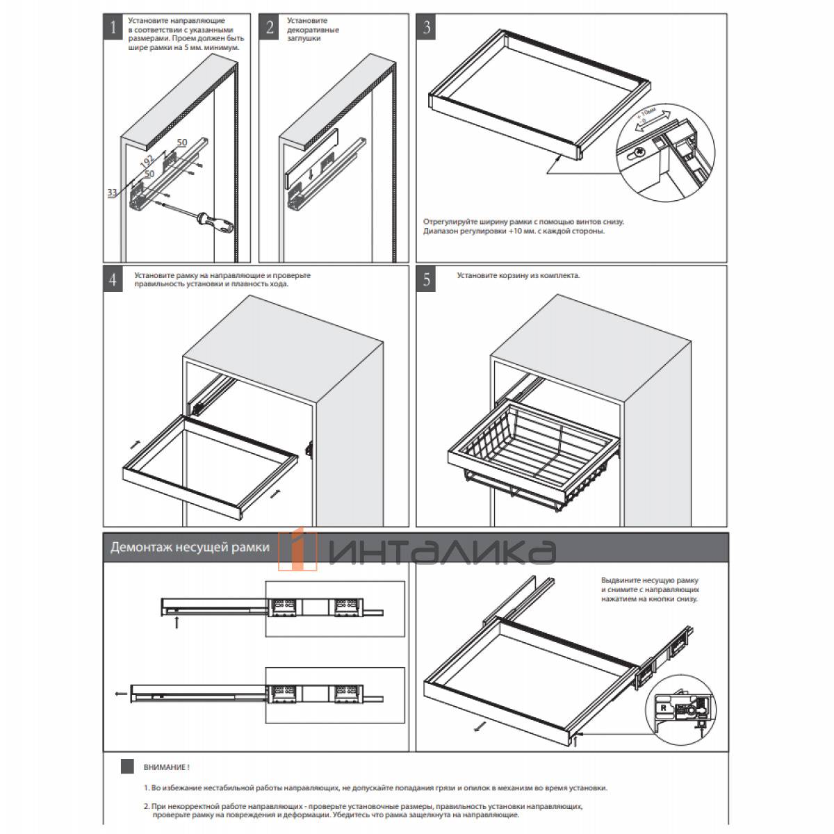 Скрытые направляющие полного выдвижения со встроенной системой демпфирования закрывают фасады плавно и бесшумно