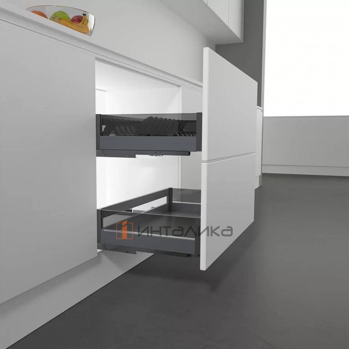 Скрытые направляющие полного выдвижения со встроенной системой демпфирования закрывают фасады плавно и бесшумно