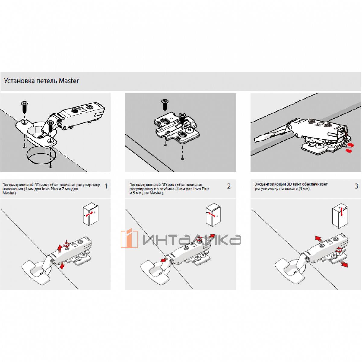 Регулировка в двух плоскостях: по горизонтали + 6 /- 1 мм, по глубине + 3 /- 2 мм