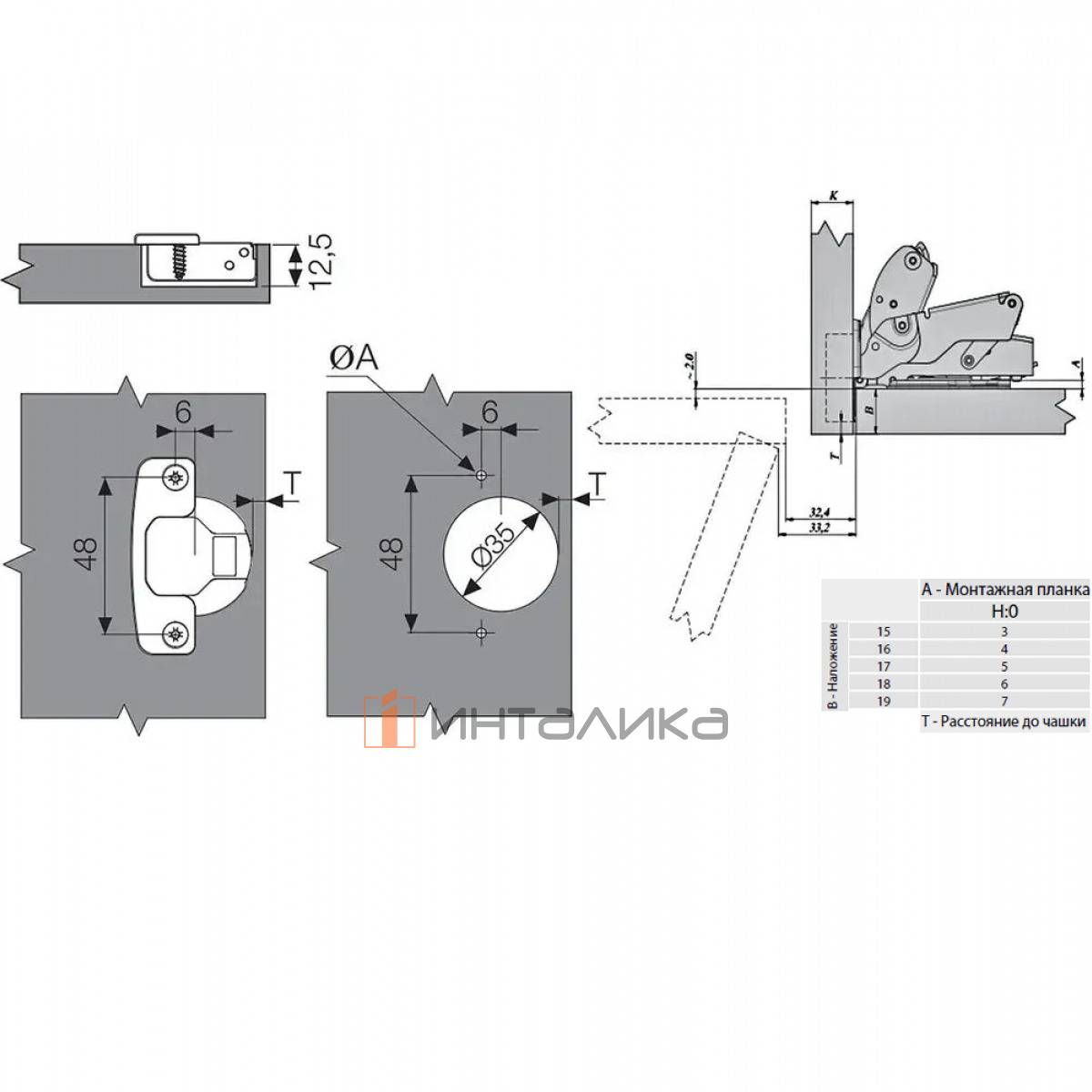 Чашка петли по глубине 11,5 мм, диаметр составляет 35 мм, крепится на саморезы Ø3,5x16 мм