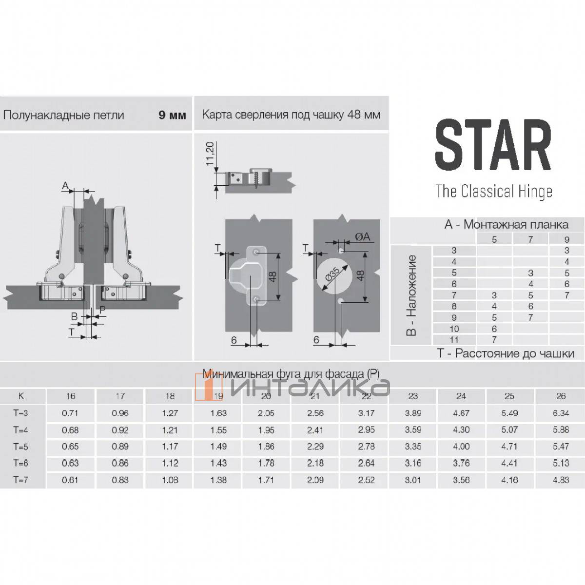 Петля SAMET Star 110°, для дверей 16-26, полунакладная, TH48 Ø35, под саморез, Slide-On, никель, 101732Y