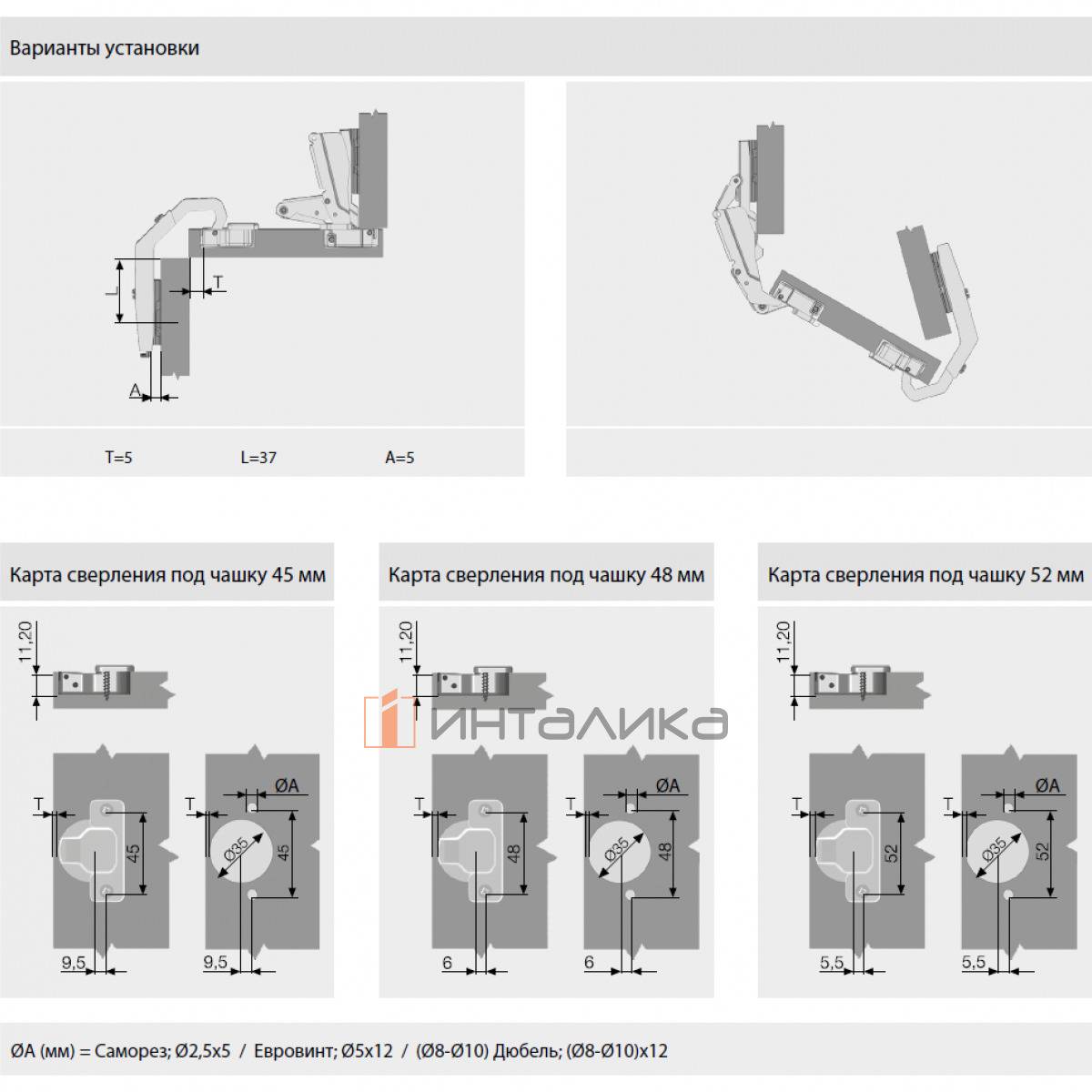 Чашка петли по глубине 11,2 мм, диаметр составляет 35 мм, крепится на саморезы Ø3,5x16 мм