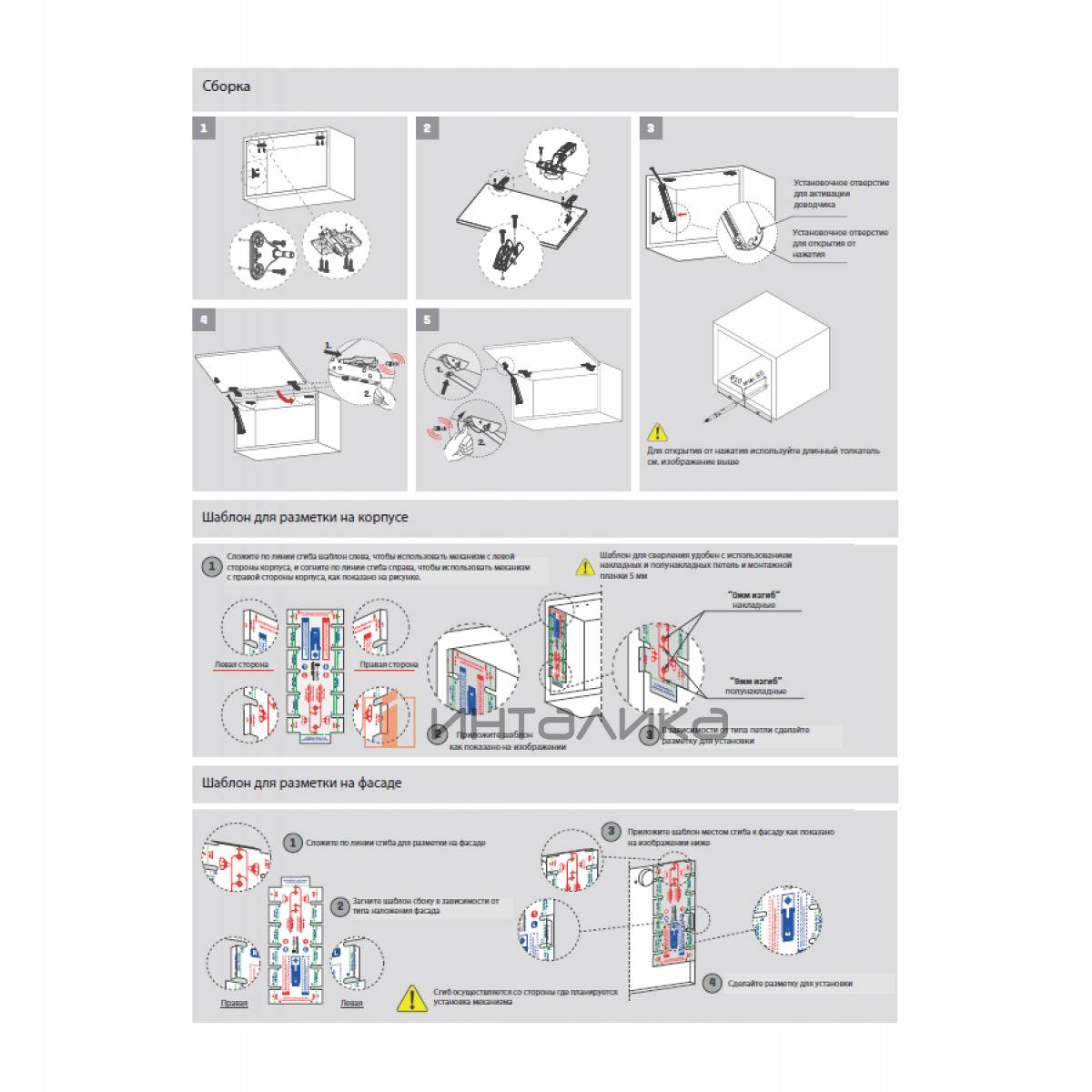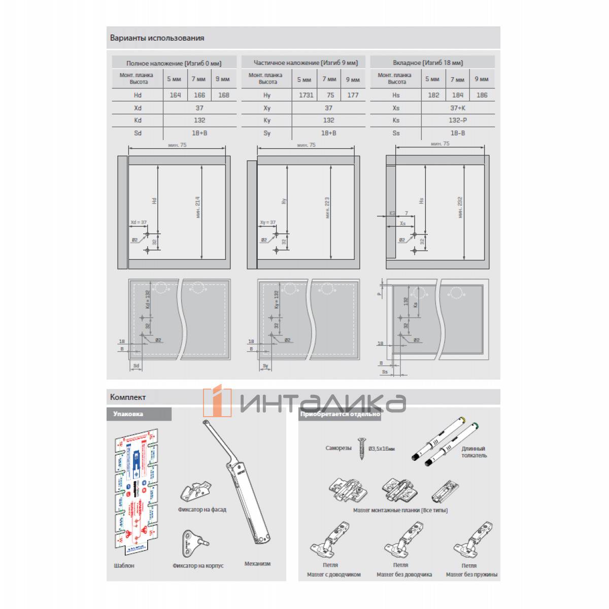 Примечание: петли, монтажные планки, толкатели в комплект не входят, заказываются отдельно