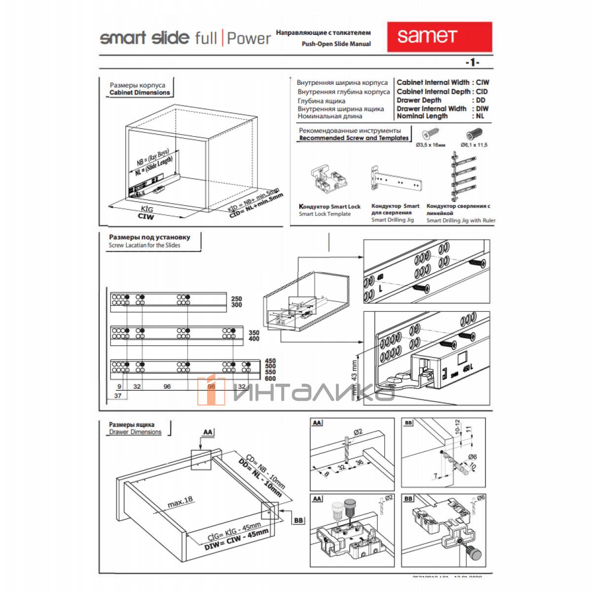 Комплект скрытых направляющих полного выдвижения SAMET Smart Slide для деревянных ящиков