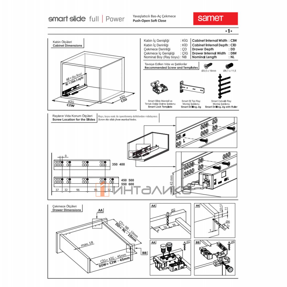 Комплект скрытых направляющих полного выдвижения SAMET Smart Slide для деревянных ящиков