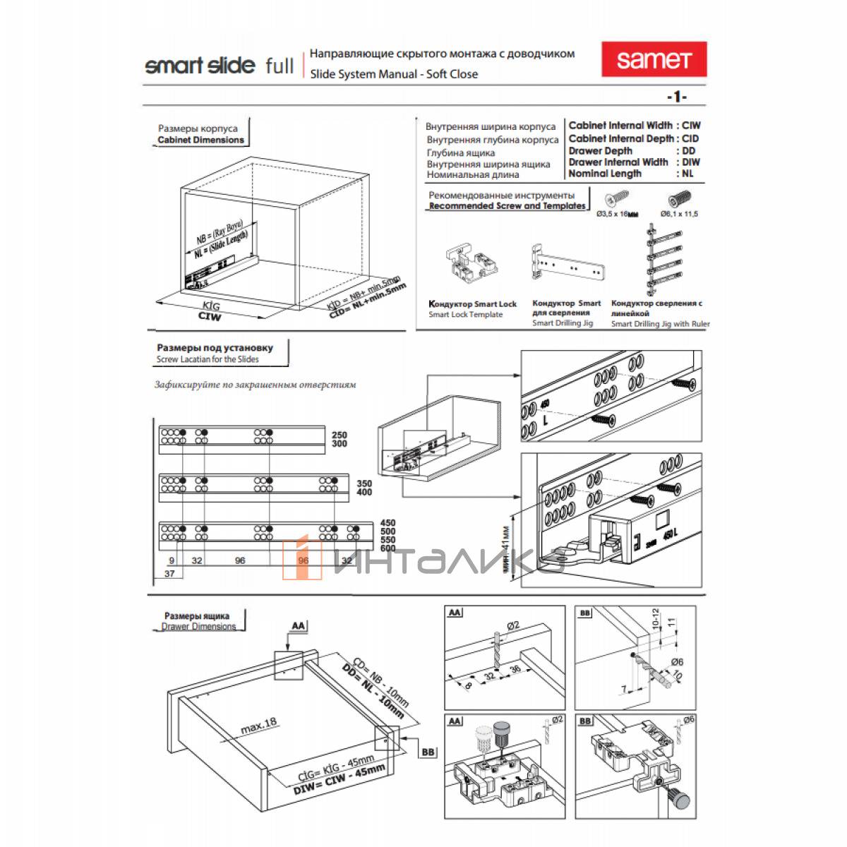 Комплект скрытых направляющих частичного выдвижения SAMET Smart Slide для деревянных ящиков