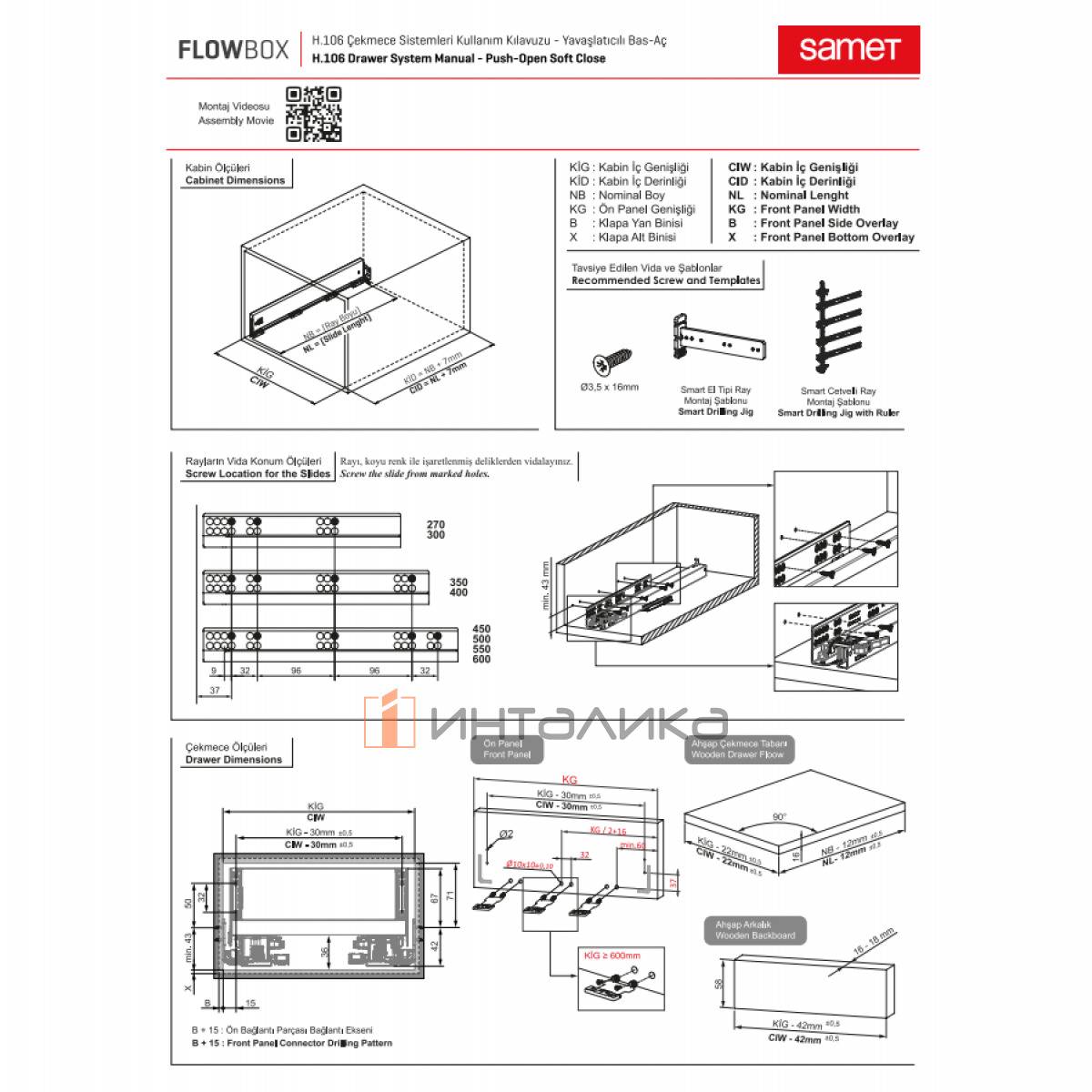 Комплект ящика SAMET Flowbox, H106, полное выдвижение, Push-Open+Soft-Close, NL550, G40, белый, 12716713670176
