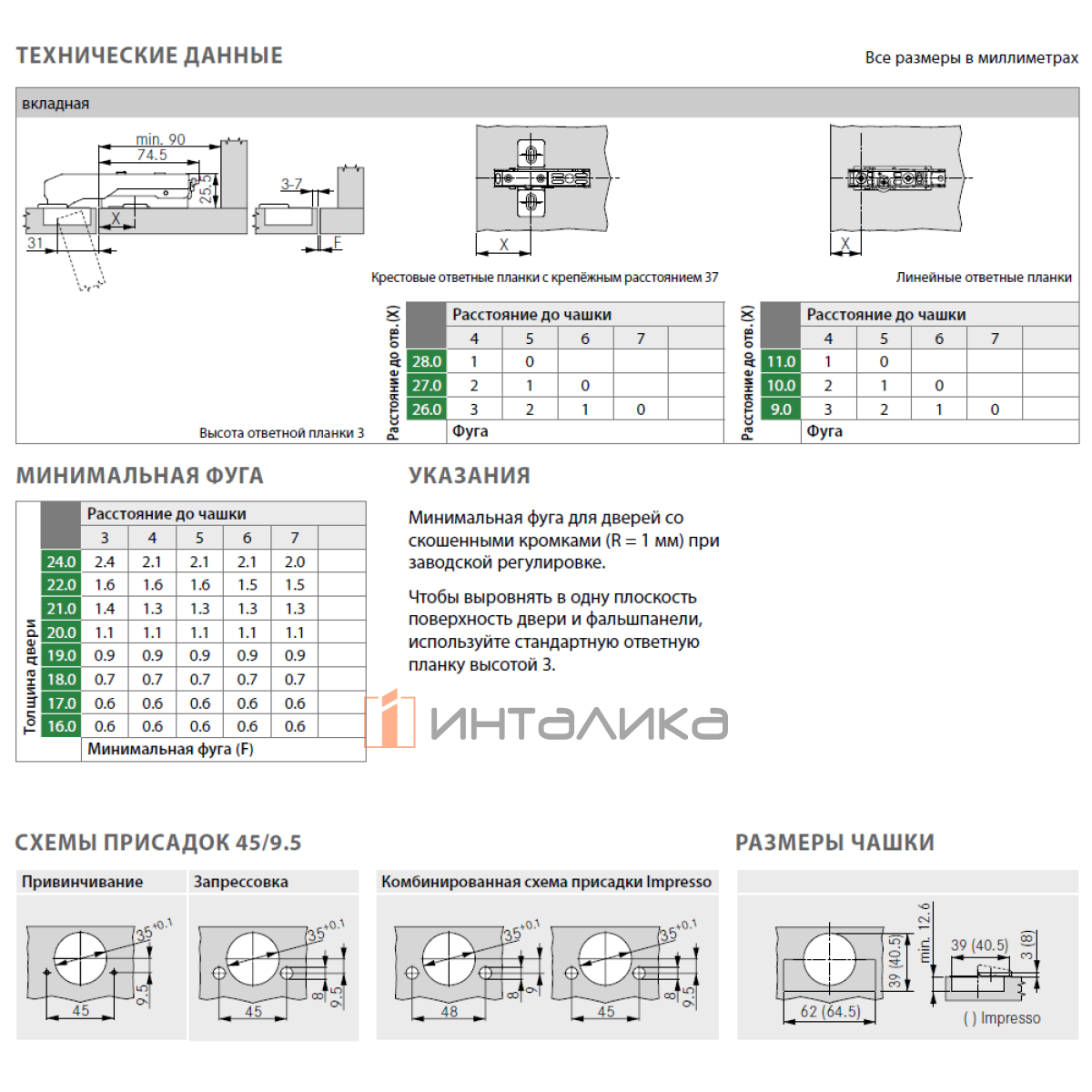 Скрытая мебельная петля Grass Tiomos 110° для вкладных фасадов, под фальшпанель