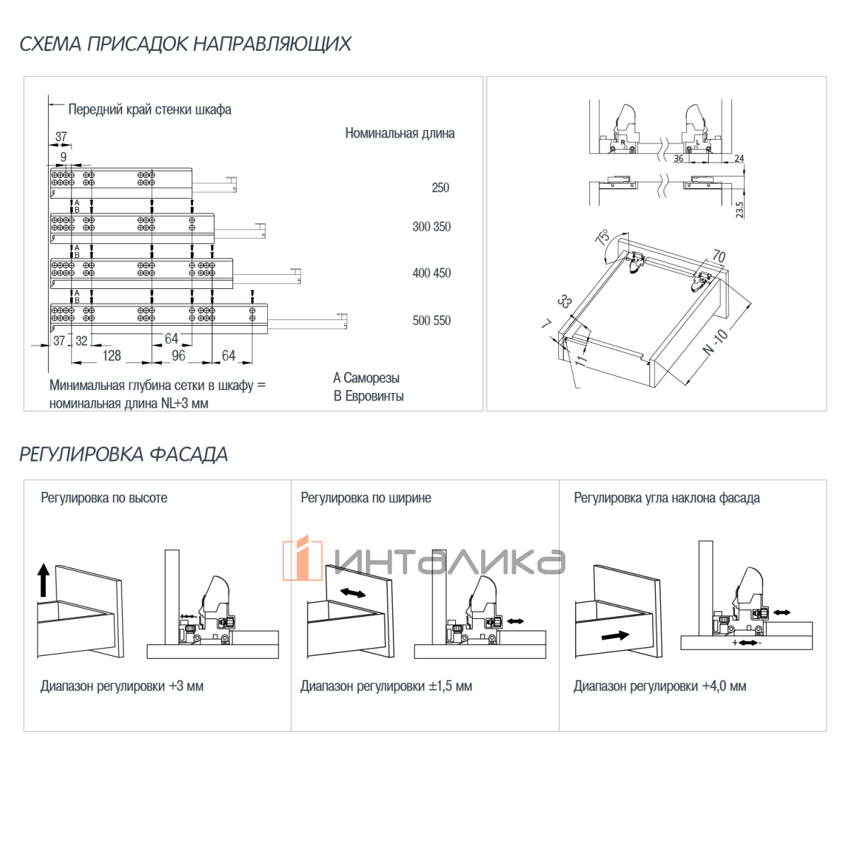 Регулировка фасада: по высоте + 3 мм, по ширине +/-1,5 мм, по углу наклона фасада +4 мм