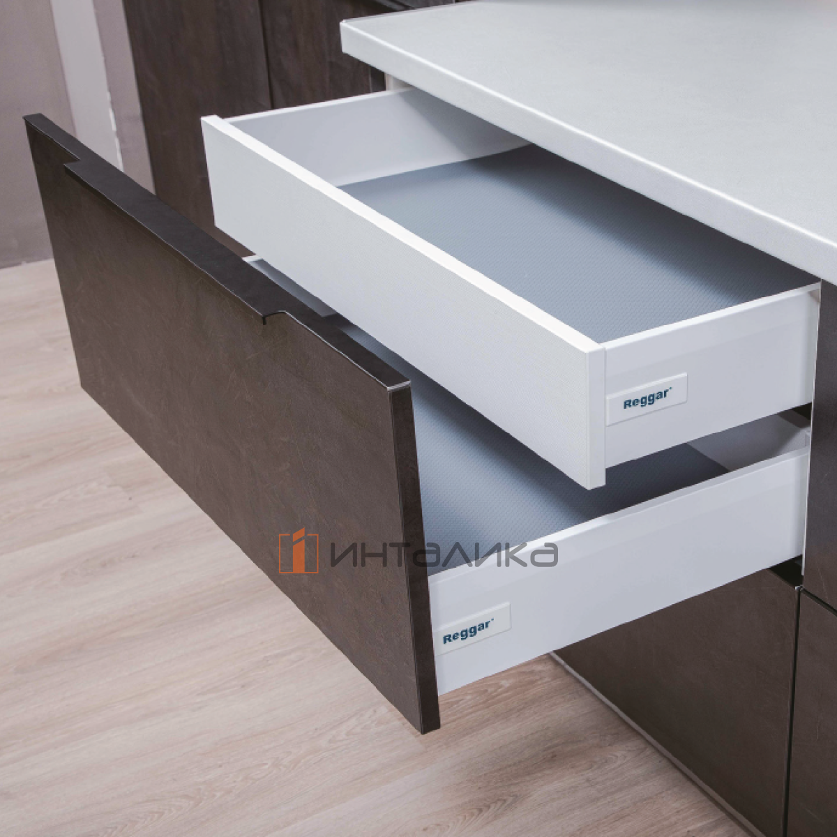 Встроенный бесступенчатый амортизатор Reggar нового поколения закрывает выдвижные ящики плавно, надежно и бесшумно