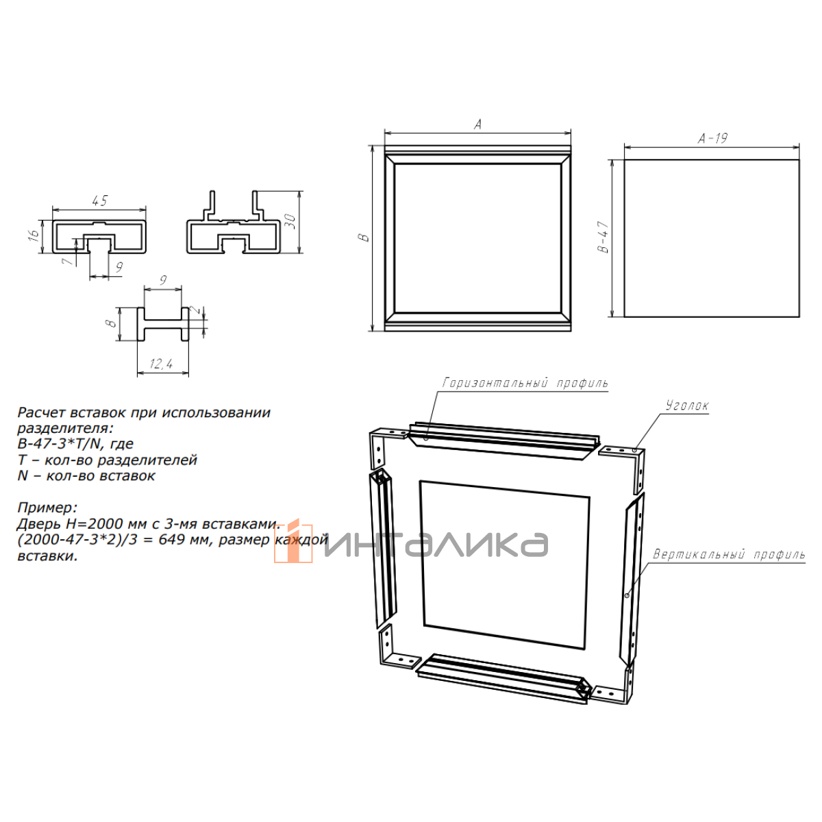 Применяется для сборки рамки двери в системах межкомнатных перегородок FM903/905/910/911, совместно с вертикальным профилем, а также для вклеивания вставок толщиной 8 мм