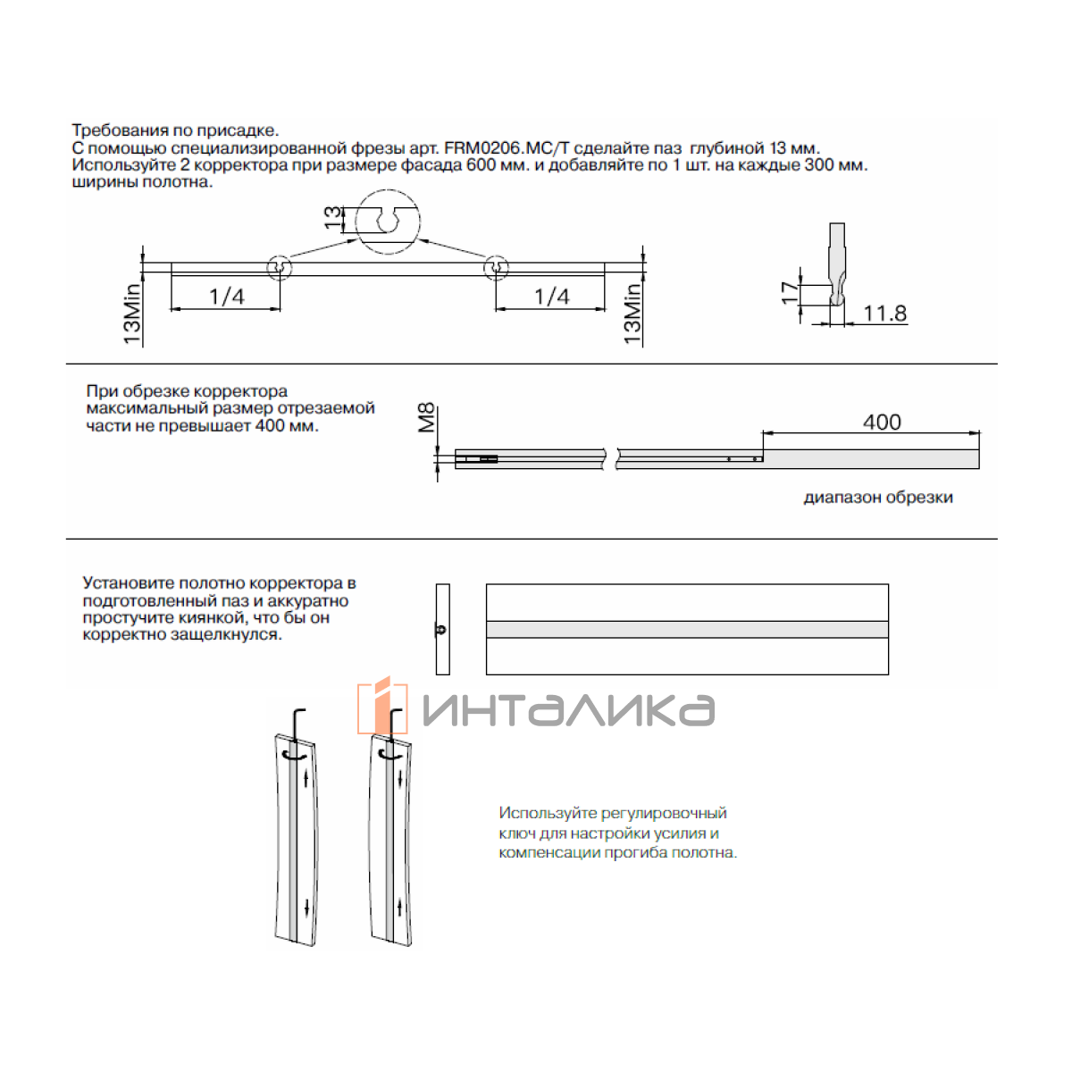 Регулировка осуществляется с торца фасада, корректор можно упиливать на 400 мм