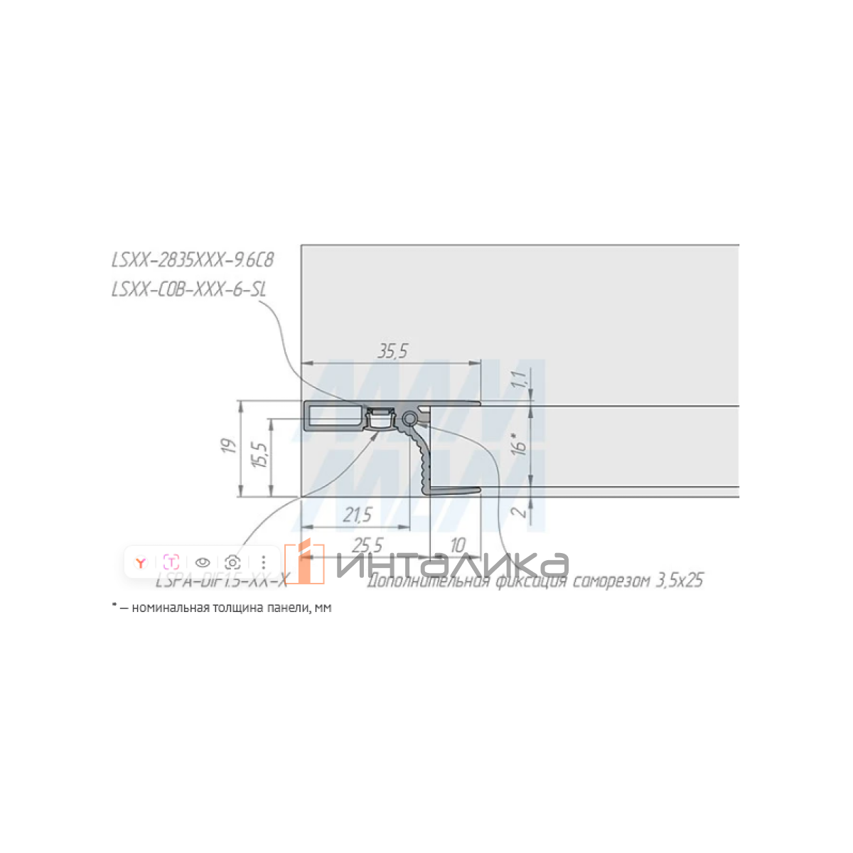• конструкция профиля предусматривает дополнительную фиксацию саморезами через боковые стенки корпуса