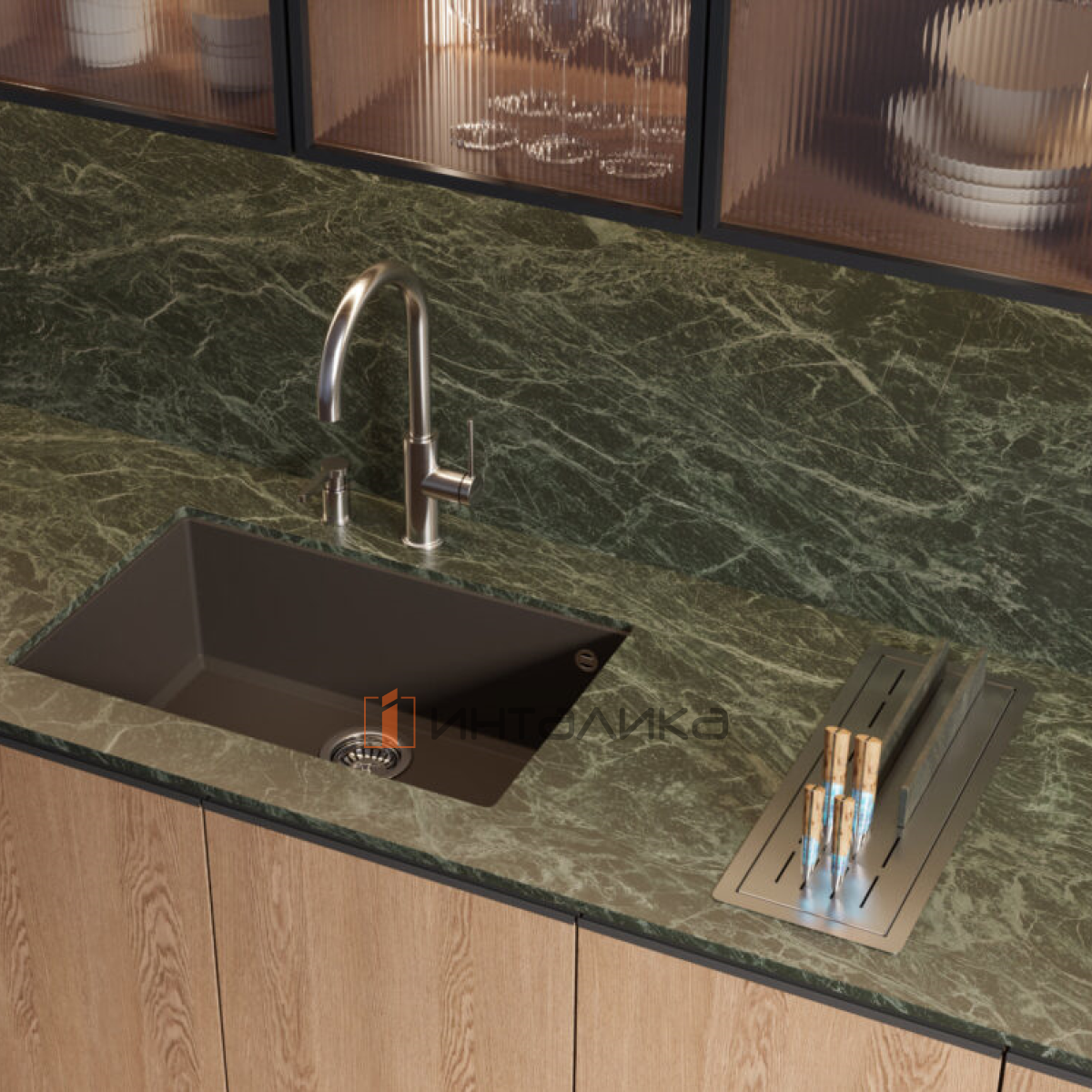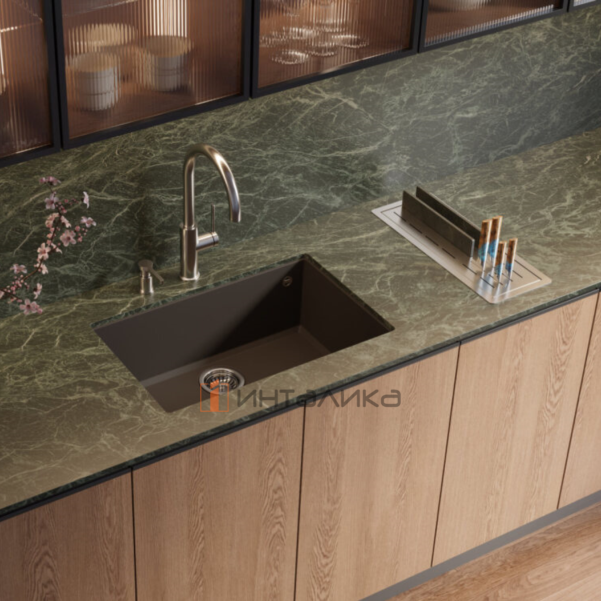 Встраиваемая сушка для посуды идеально подходит для организации пространства вокруг мойки, упрощая доступ к часто используемым кухонным принадлежностям