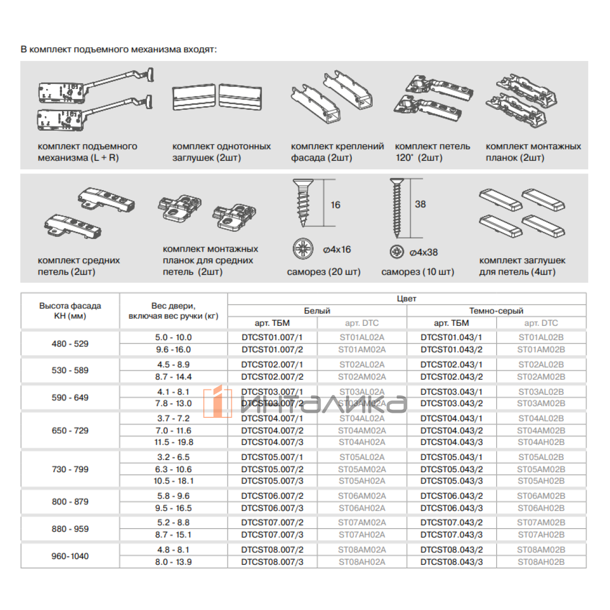 Примечание: в комплекте с механизмом идет комплект петель, весь необходимый крепеж и бумажный шаблон