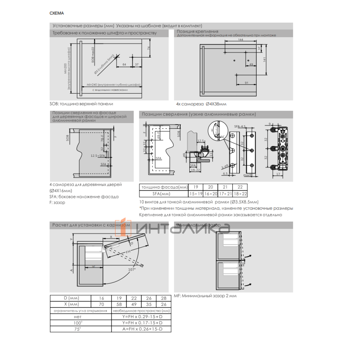 Точная регулировка фасада: по горизонтали +/- 2 мм, по вертикали +/- 2 мм, по глубине +/- 2 мм, регулировка скорости закрывания