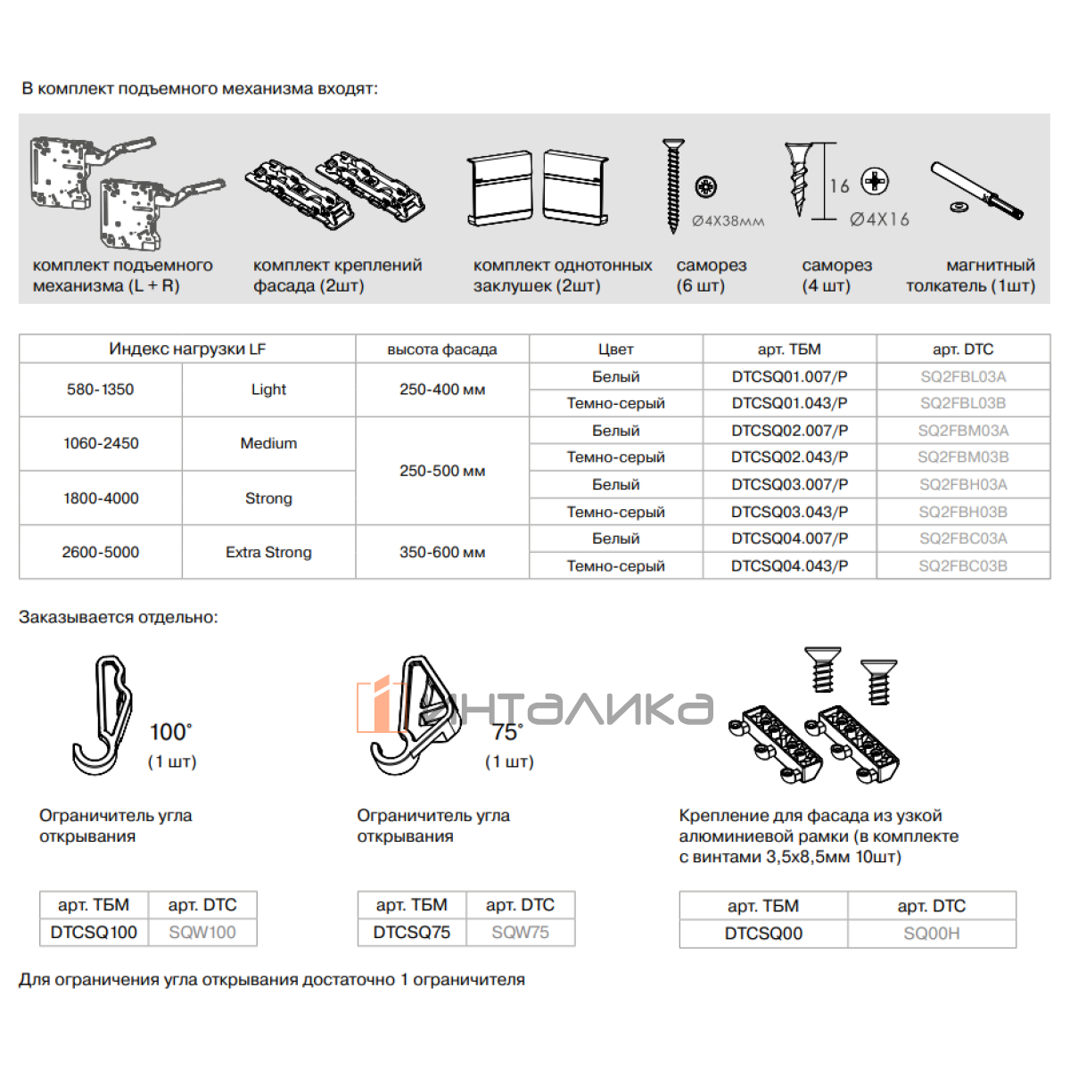Комплект откидного подъемного механизма DTC Top Stay SQ Push, H250-500, индекс нагрузки 1800-4000, белый, DTCSQ03.007/P