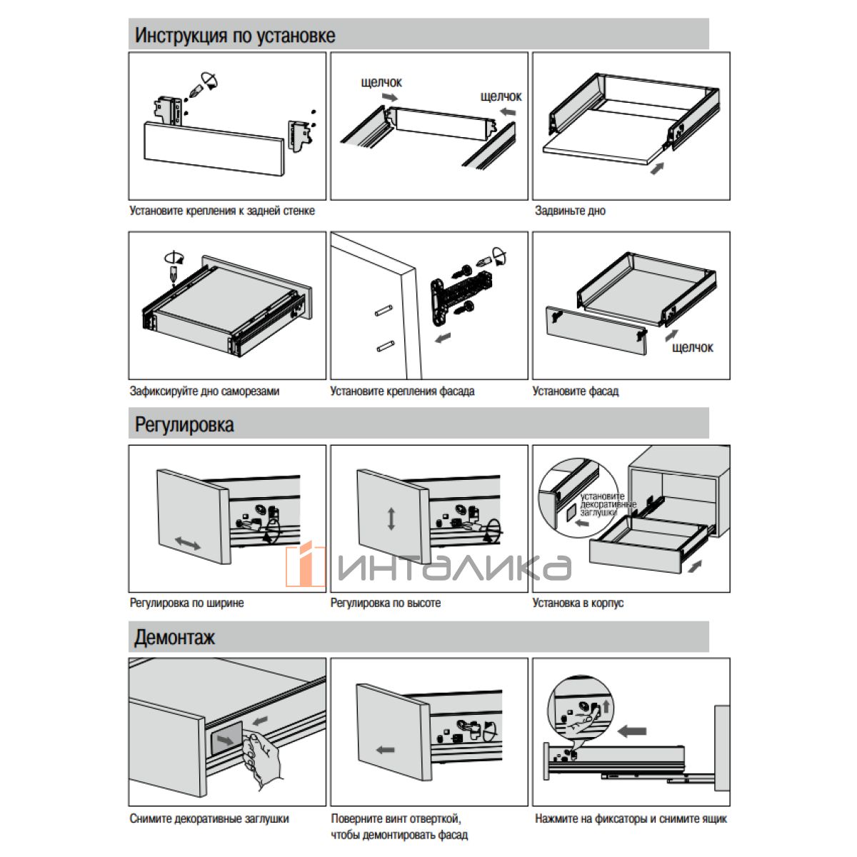 Монтаж фасада производится без инструмента, с помощью соединителей передней панели под прикручивание