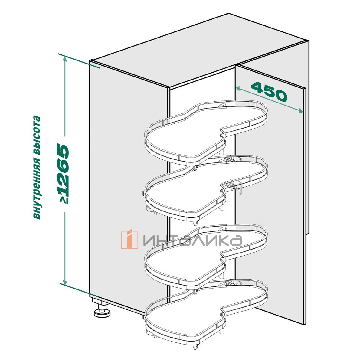 Поворотно-выдвижной механизм KESSEBOHMER Le Mans 600, 4 полки Arena style с доводчиками на закрывание, Anti-slip, H1265мм, левый, белый/хром, 3579650005