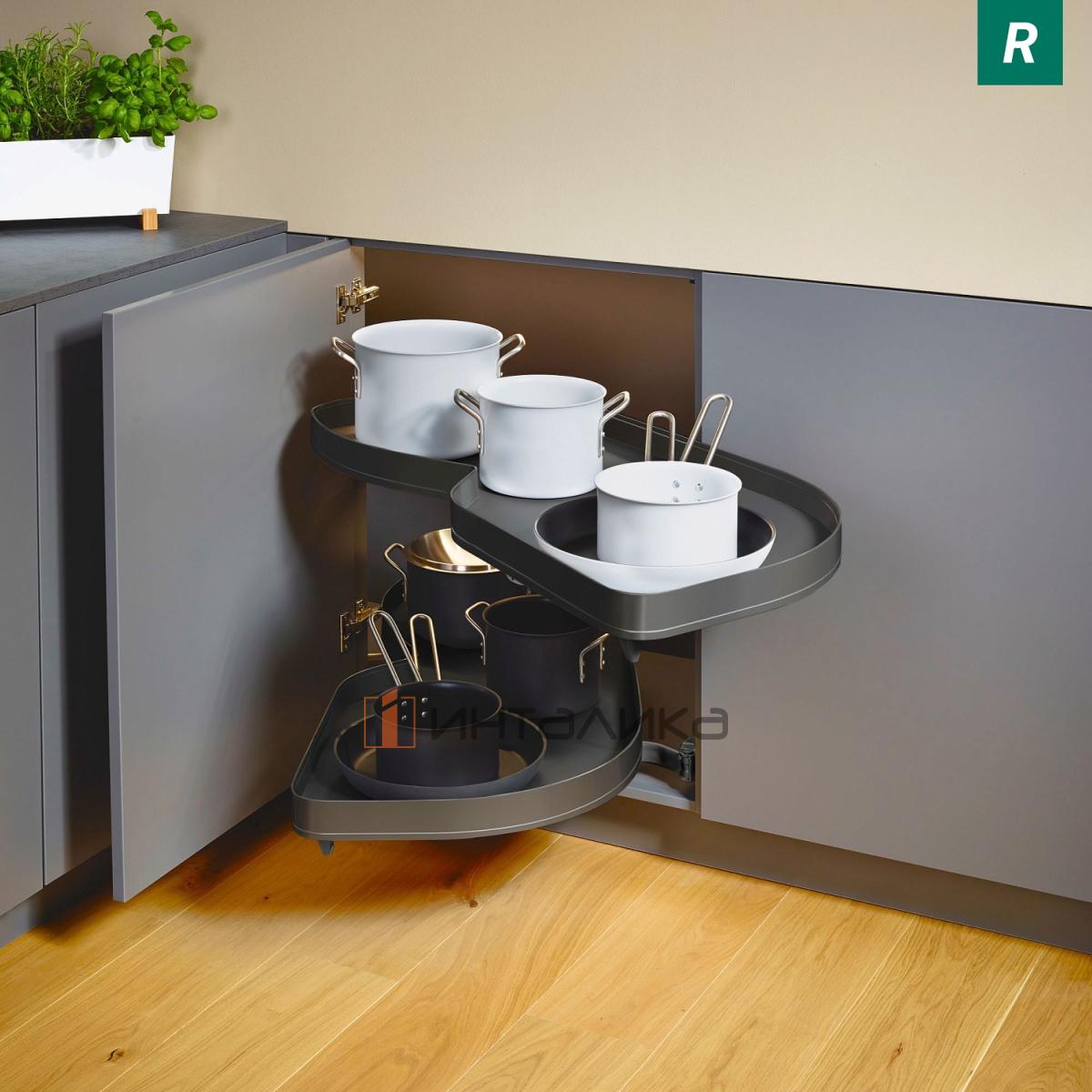 Поворотно-выдвижной механизм KESSEBOHMER Le Mans 500, 2 полки Arena pure с доводчиками на закрывание, Anti-slip, H720-900мм, правый, антрацит, 2909789846