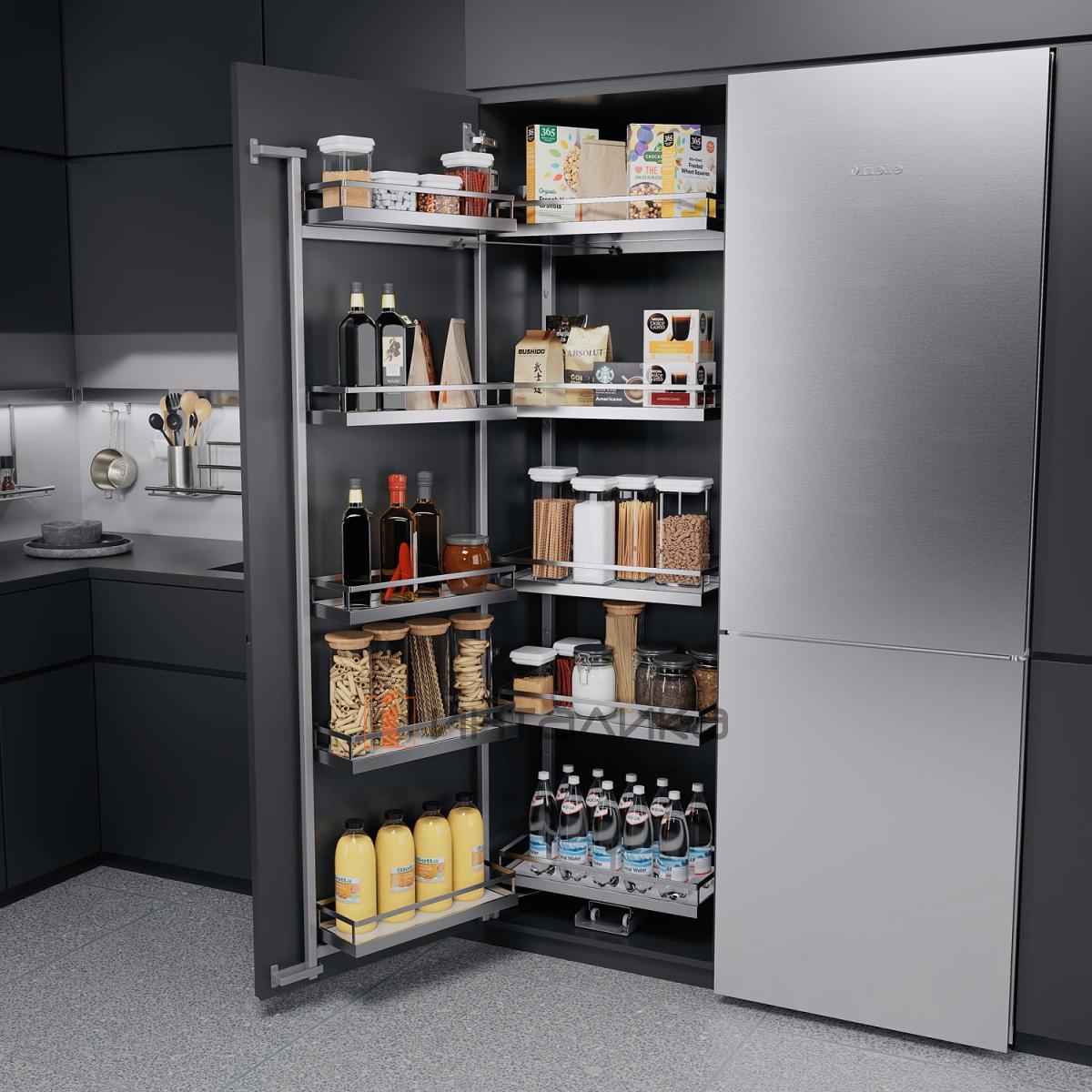 Частичное выдвижение полок на раме, при открывании фасада, обеспечивает комфортный доступ и отличный обзор содержимого