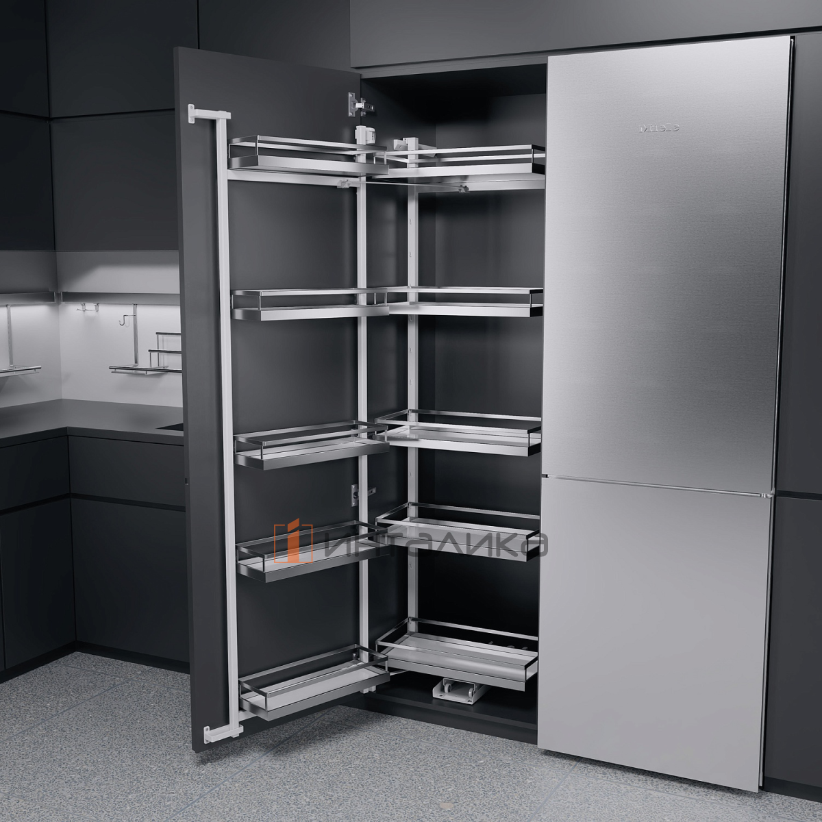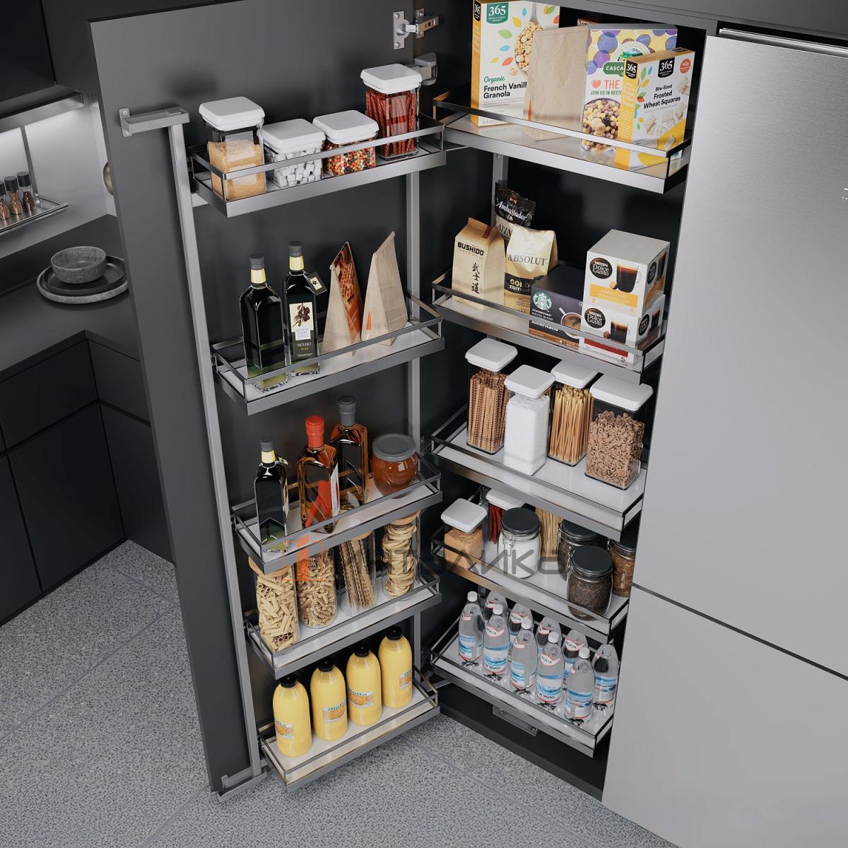 Частичное выдвижение полок на раме, при открывании фасада, обеспечивает комфортный доступ и отличный обзор содержимого