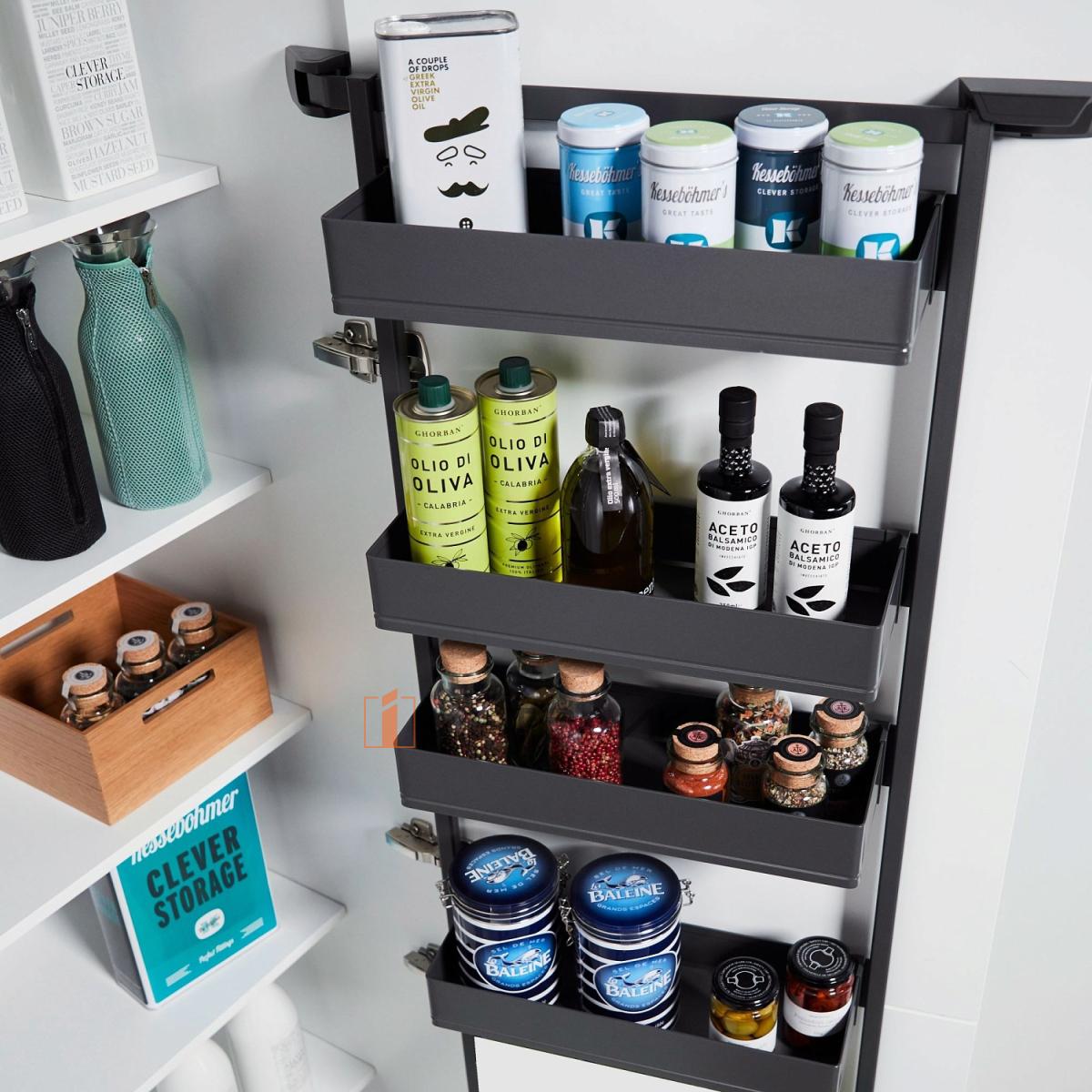 Пространство шкафа делится в пропорции 60/40 для дополнительного обзора и быстрого доступа к продуктам, при этом вес полок и содержимого переносится на корпус и не влияет на функционирование фасада и легкость его открывания