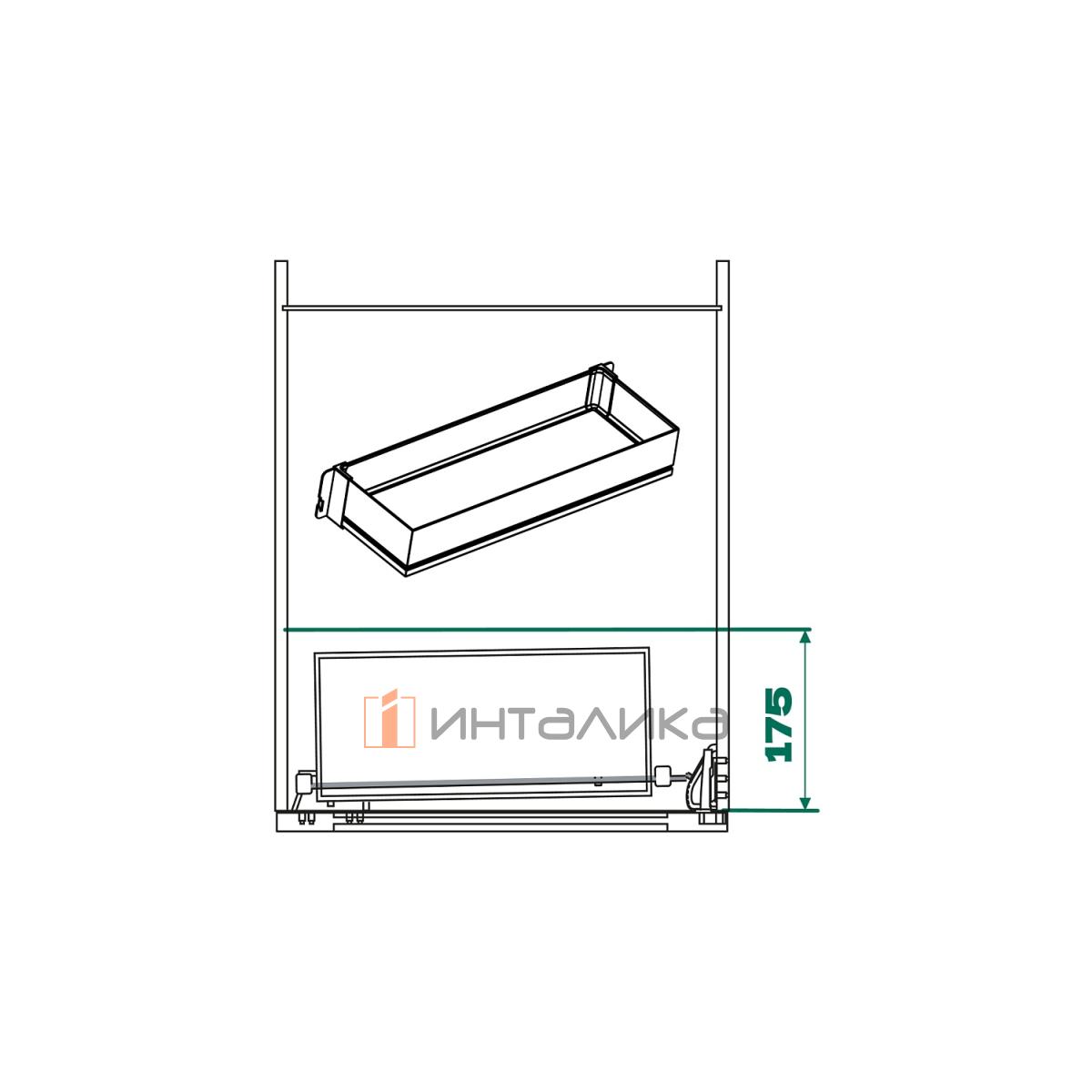 Пространство шкафа делится в пропорции 60/40 для дополнительного обзора и быстрого доступа к продуктам, при этом вес полок и содержимого переносится на корпус и не влияет на функционирование фасада и легкость его открывания