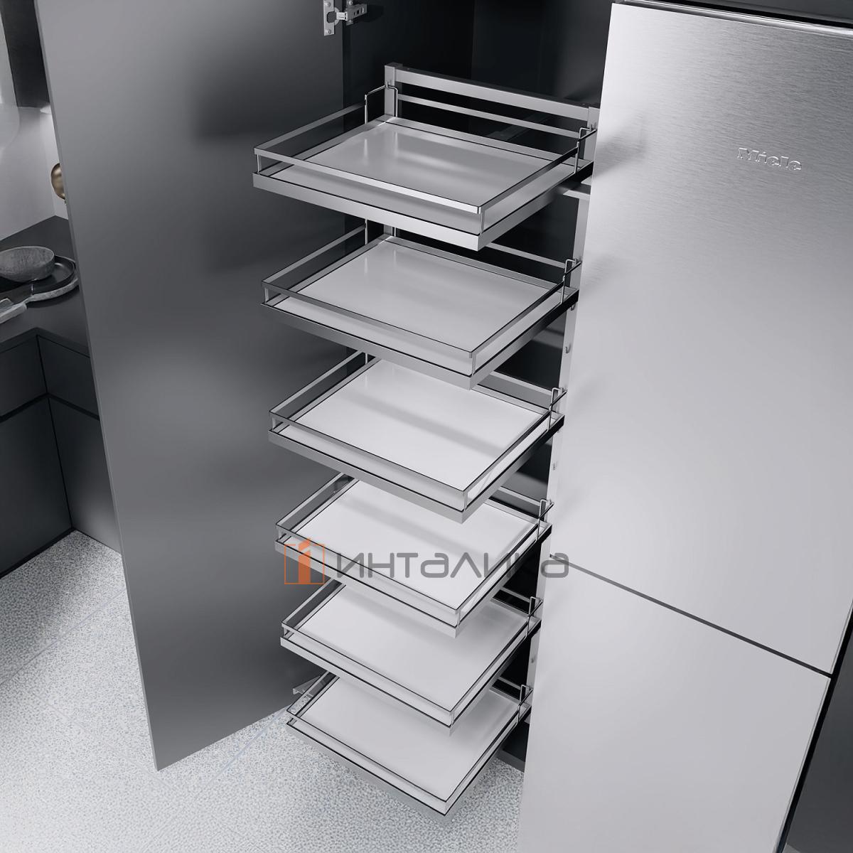 Частичное выдвижение полок на раме, при открывании фасада, обеспечивает комфортный доступ и отличный обзор содержимого