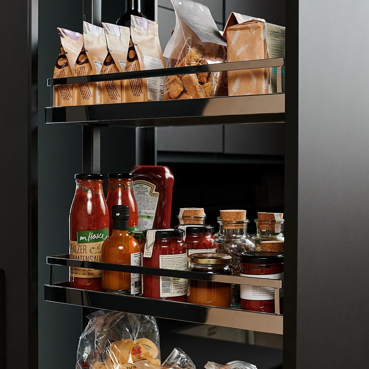 Выдвижная система KESSEBOHMER Dispensa применяется в высоких шкафах, пеналах, колоннах для эффективного использования внутреннего пространства