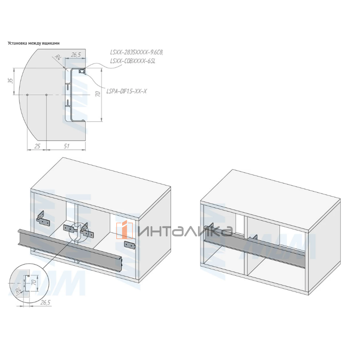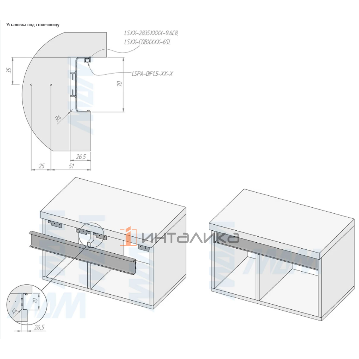 • один профиль - горизонтальная установка под столешницу, вертикальная установка в колонну; горизонтальная установка между ящиками нижнего яруса, вертикальная установка между колоннами;