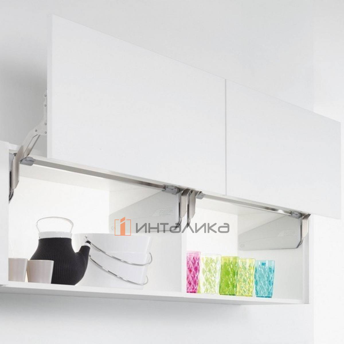 Расположение силовых механизмов в верхней части фасада дает возможность на установку дополнительных полок