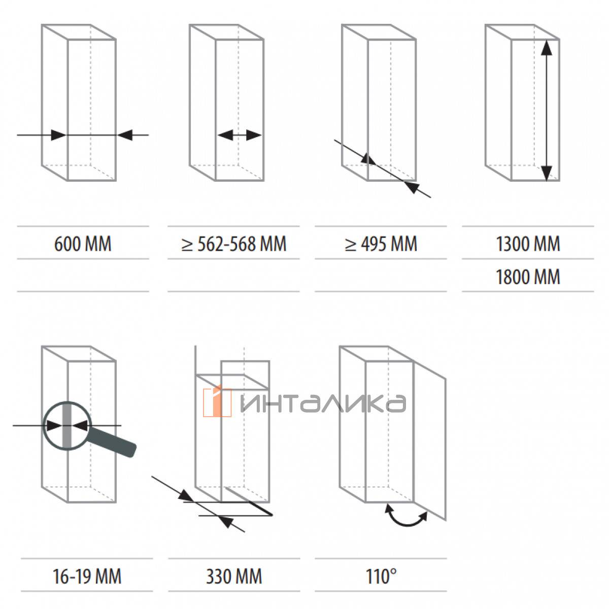 Угол открывания фасада 110 градусов (петли в комплект не входят, заказываются отдельно)