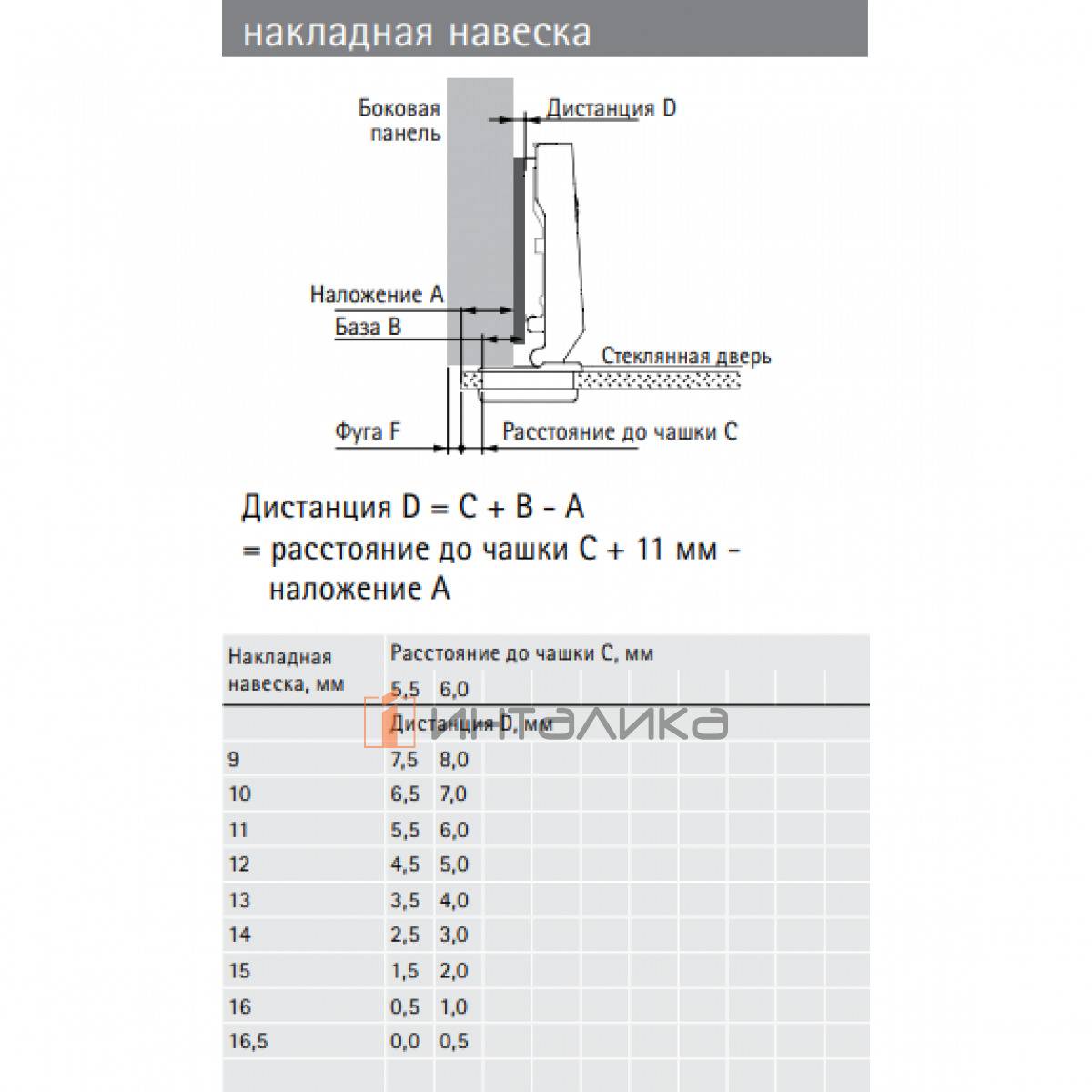 Петля HETTICH Intermat 9904 (B11) 95°, для стеклянных дверей 4-6.5 мм, накладная, Ø26, под саморезы, (V50), никель l 72960 l, 72960