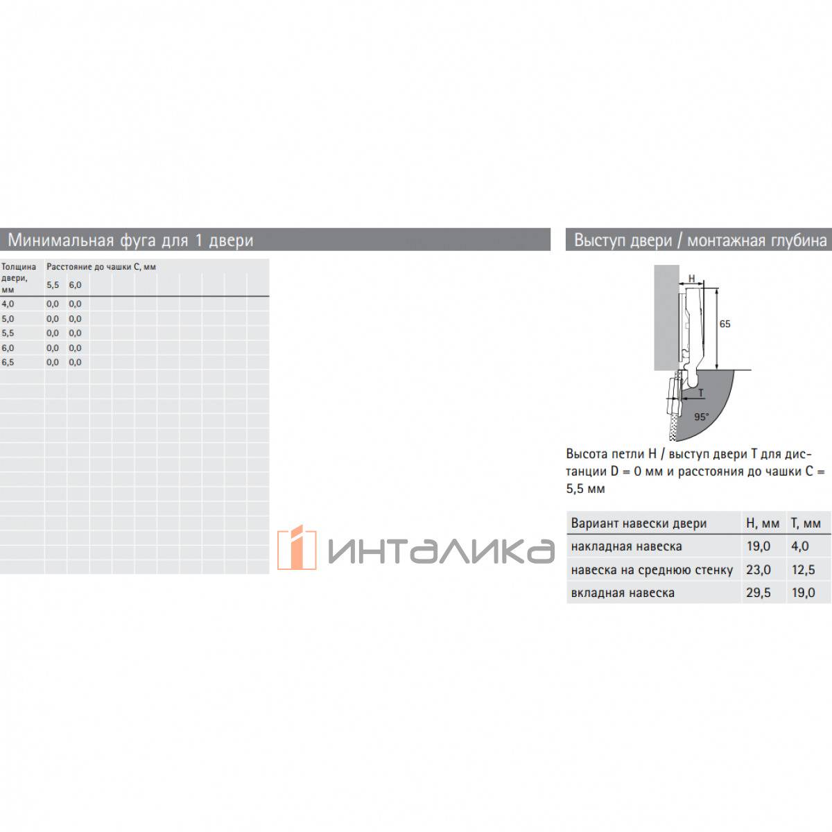 Петля HETTICH Intermat 9904 (B4) 95°, для стеклянных дверей 4-6.5 мм, вкладная, Ø26, под саморезы, (V50), никель l 72968 l, 72968