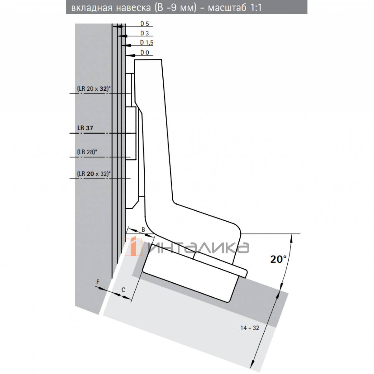 Петля HETTICH Intermat 9936 W20 (B-9) 95° угловая для дверей 14-32 мм вкладная под пресс