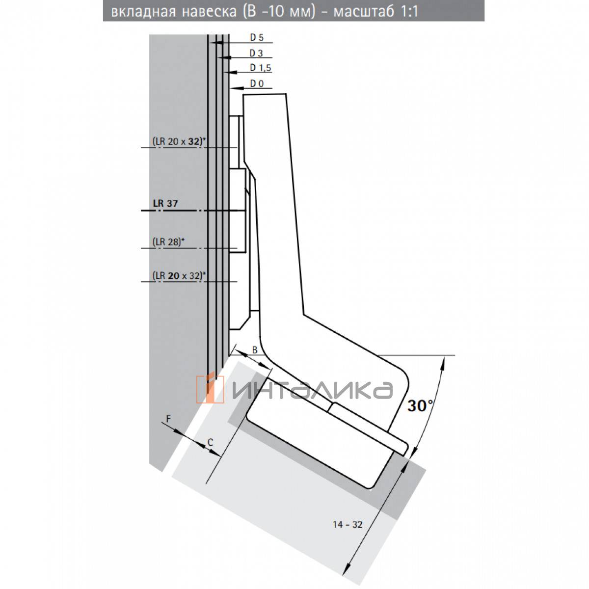Петля HETTICH Intermat 9936 W30 (B-10) 95° угловая для дверей 14-32 мм вкладная под саморезы