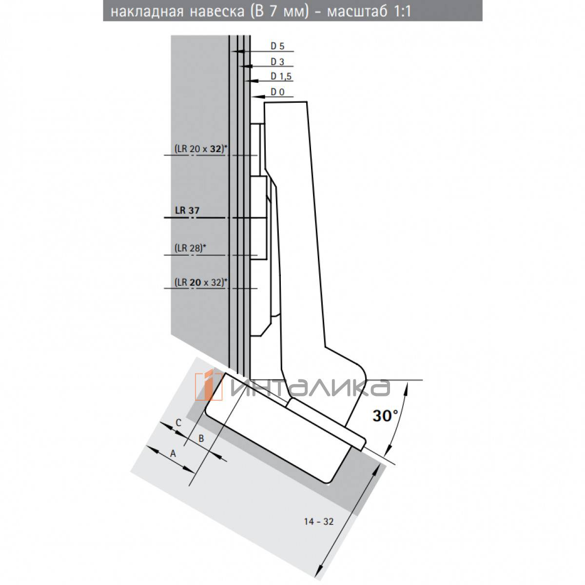 Применяется для открывания мебельных фасадов толщиной от 14 до 32 мм