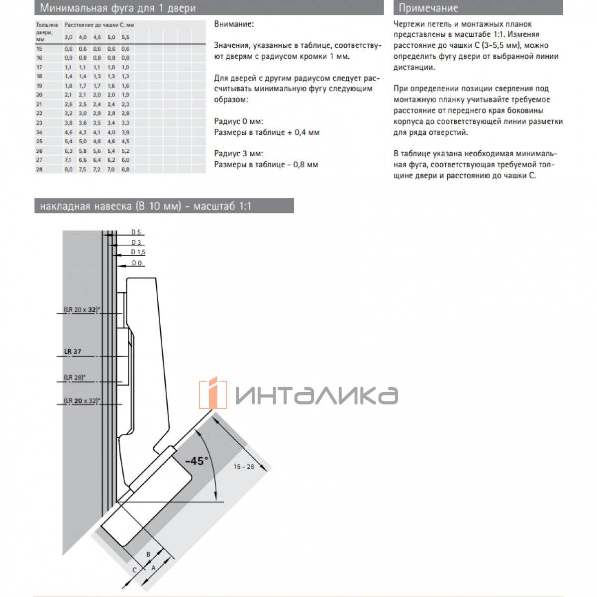 Петля HETTICH Intermat 9944 W-45 (B10) 125° угловая для дверей 15-28 мм накладная под саморезы