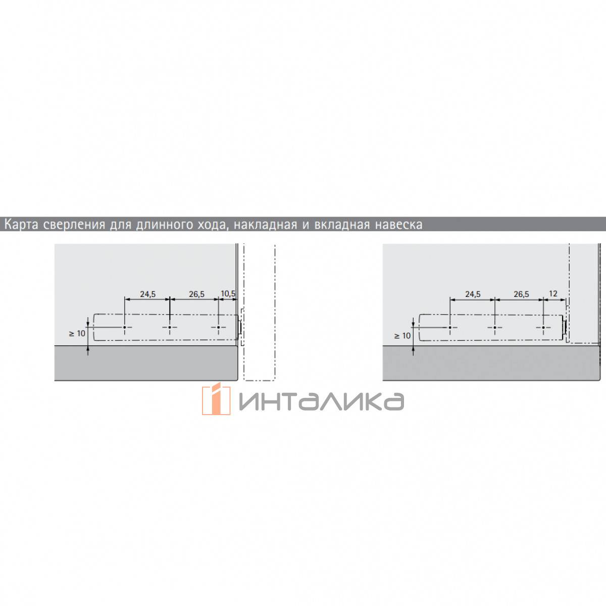 Применяется для накладной, полунакладной и вкладной навески с петлями без пружин