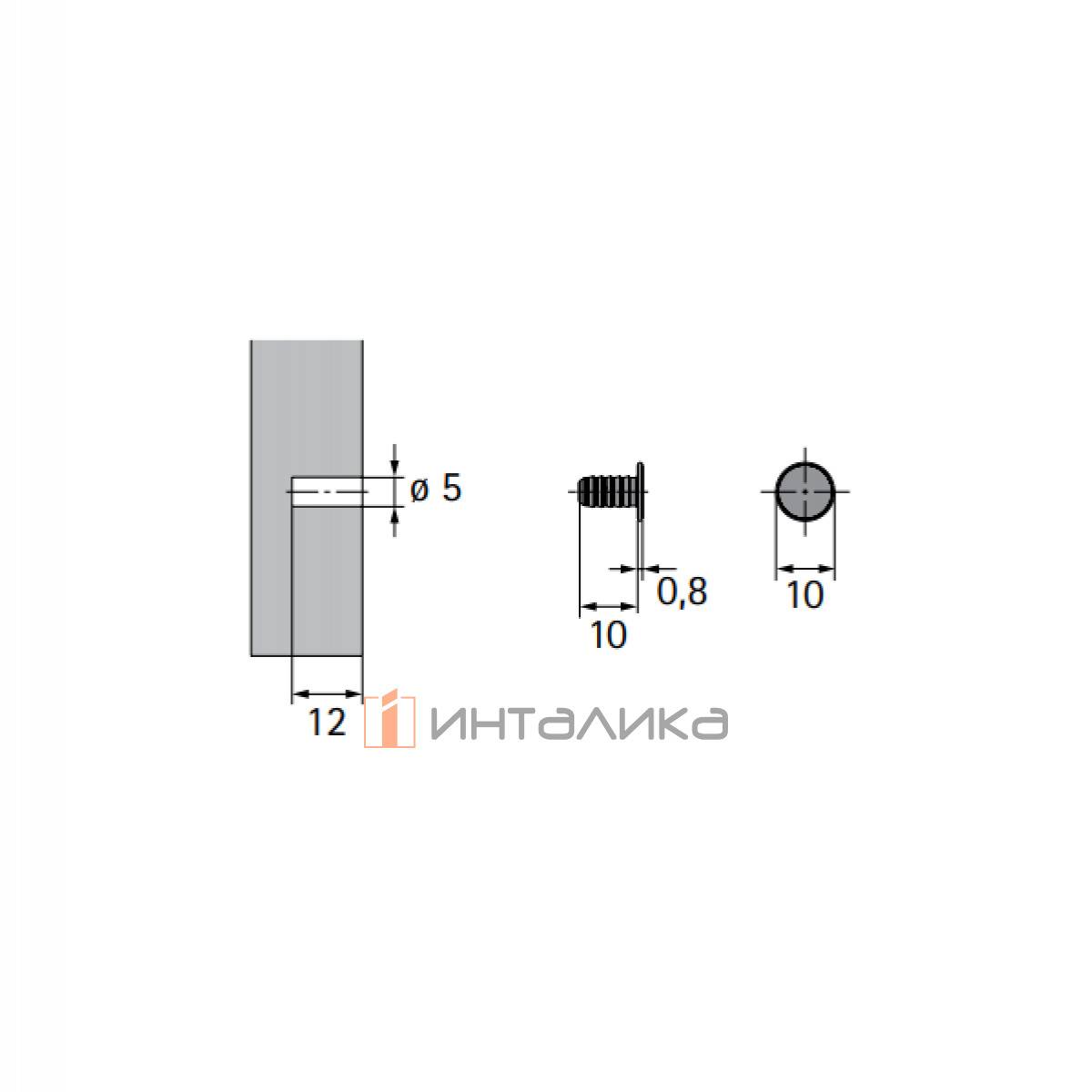 Габаритные размеры: длина планки - 10 мм, диаметр пластины - 10 мм, толщина пластины - 0,8 мм