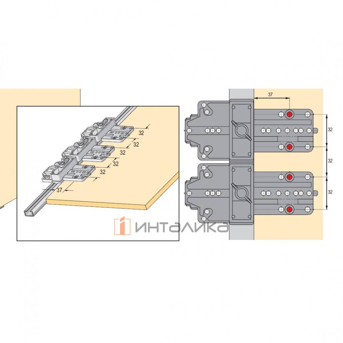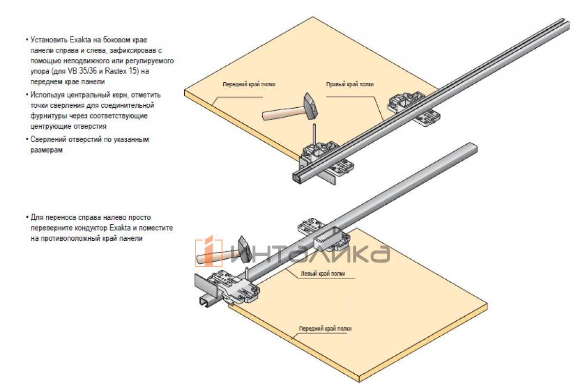 Сверлильно-разметочный кондуктор Hettich Exaсta применяется для установки петель, монтажных планок, стяжной фурнитуры, полкодержателей, опор для откидных элементов и другой фурнитуры по Системе 32
